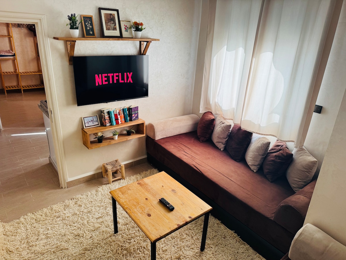 This one-bedroom apartment is perfect for solo travellers, couples, and surfers. The apartment is decorated with a minimalist style and features a spacious bedroom with a queen-size bed and ample storage space. The living room is bright and airy with 2 sofa beds, TV and kitchenette. The apartment is located in the heart of Tamraght, near "Hey Yallah Cafe" Walking distance from Devil's Rock, and a variety of shops, cafes & amenities