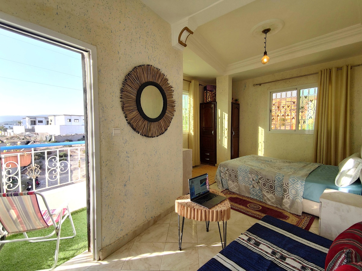 C'est le seul appartement dont le balcon de 17m2 est construit au dessus du chemin qui longe la plage, offrant une vue exceptionnelle sur les vagues, le village, les pêcheurs, les surfeurs. Très confortable, décoré et entretenu avec soin pour un séjour exceptionnel au dessus de l'océan, proche des nombreux cafés et restaurants longeant la plage et à 2 pas des écoles de surf, au coeur de ce village berbère convivial mêlant pêcheurs, commerçants, surfeurs du monde entier...et quelques touristes.