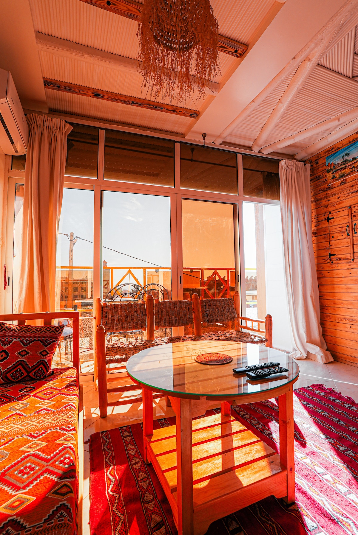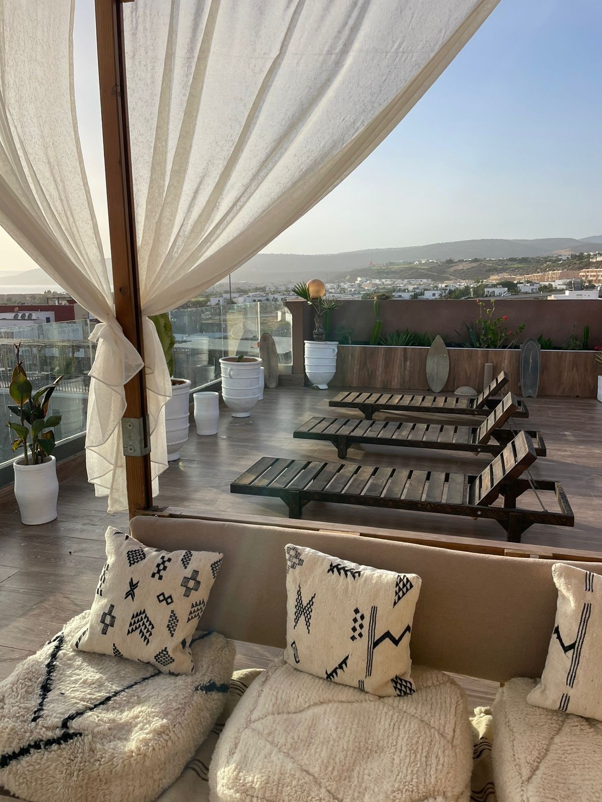 A spacious 55m² Moroccan-style apartment with large windows offering a beautiful ocean view. It features a double bed, salon with large sofa, TV, fully equipped kitchen, private bathroom with shower, good Wi-Fi high speed, a work desk, and a small fridge. Perfect for couples, families, and surfers. Ideal place to enjoy your vacation while working remotely. Breakfast (included in the price) is served on the rooftop terrace, the perfect spot to start your day with a beautiful ocean view.