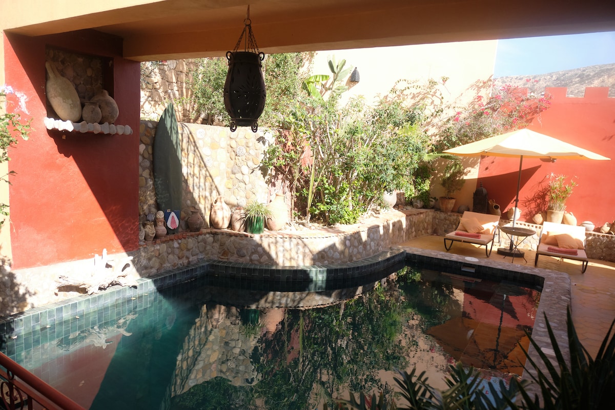 Chambre et terrasse sur l'Atlas à 3km de Taghazout La chambre dispose d'une cheminée extérieure , d'un jardin ombragé. Repas "faits maison" par vos hôtes berbères (en option). Vous serez les seuls locataires du riad durant votre séjour. Une cuisine et une salle-de-bains intérieure ? Réservez sur notre annonce Le Riad berbère. Haut de Taghazout, au même endroit et même tarif pour 2 - airbnb.fr/h/riadatlas