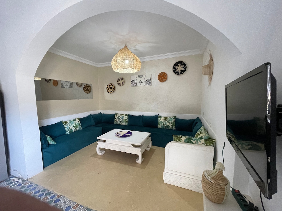 Nestled on the hills of Imi Ouaddar, the GROUND FLOOR of this villa will seduce you with its proximity (200 meters - 3 minutes on foot) to the beach of Imi Ouaddar and with its decoration combining tradition and modernity. Its position on the ground floor will ensure freshness during the summer. Feel yourself at home. We make sure to do everything to guarantee your comfort. Please read the full description!