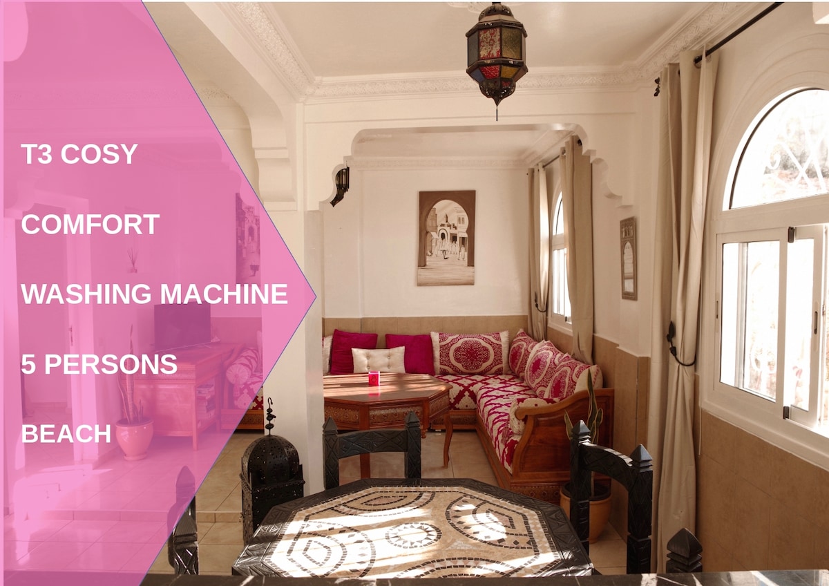 C'est le seul appartement dont le balcon de 17m2 est construit au dessus du chemin qui longe la plage, offrant une vue exceptionnelle sur les vagues, le village, les pêcheurs, les surfeurs. Très confortable, décoré et entretenu avec soin pour un séjour exceptionnel au dessus de l'océan, proche des nombreux cafés et restaurants longeant la plage et à 2 pas des écoles de surf, au coeur de ce village berbère convivial mêlant pêcheurs, commerçants, surfeurs du monde entier...et quelques touristes.