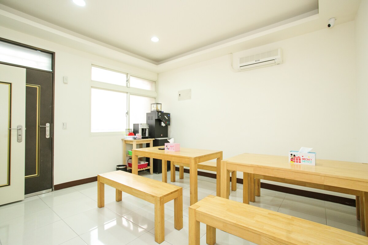 全新裝潢,設備齊全,適合家庭/團隊入住,超過20坪的寬大住所,完全私有空間。惟客廳/餐廳是開放空間空氣流通良好,沒有獨立的泠氣而以電扇吹送2個房間的冷氣。民宿在公寓的2F,須走樓梯。 恕不接待未婚男女朋友。