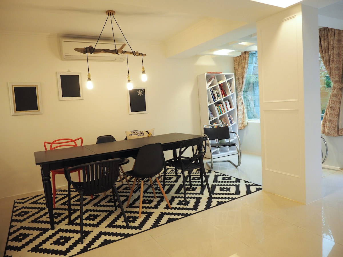 全新裝潢,設備齊全,適合家庭/團隊入住,超過20坪的寬大住所,完全私有空間。惟客廳/餐廳是開放空間空氣流通良好,沒有獨立的泠氣而以電扇吹送2個房間的冷氣。民宿在公寓的2F,須走樓梯。 恕不接待未婚男女朋友。