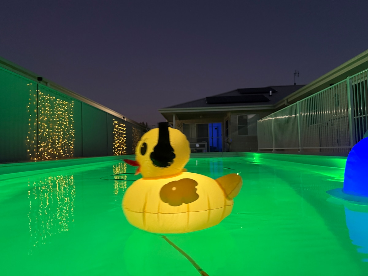Relax with the whole family at this peaceful place to stay during the country music festival. This unique home offers 3 bedrooms, with aircon and ceiling fans x2 queen beds and 1 double bed main bedroom with ensuite. 2 lounge rooms with TVs. Large kitchen, dining table and a bar. X 2 aircon and evap cooling throughout large entertaining area with tv, bbq, pool table and saltwater swimming pool that lies infront of a bali hut . 2 car under cover parking close to bus stop for your convenience.