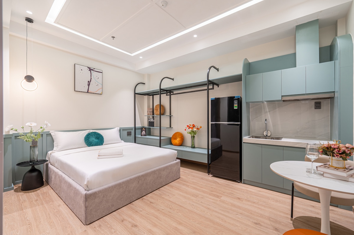 Established in 2023, We offer High Quality Short and Long Let Serviced Apartments located right on a busy street with famous cafes, restaurants, Circle K and convenient stores near by and just a few minutes walk to Bui Vien walking street, Tao Dan Park. Cost-effective compared to hotels, we provide 1 BR serviced apartments with privacy, modern style, kitchen, balcony, soundproof door & windows, desk space to work, rooftop garden, elevator, regular cleaning and the comforts of a “Home-from-Home”.