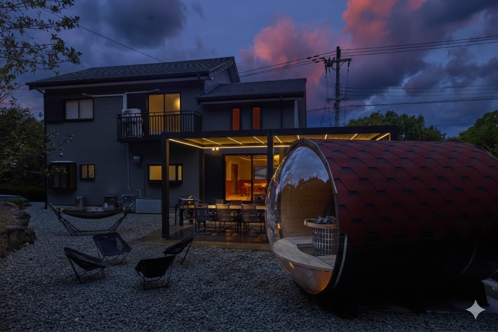 本格サウナと屋外ジャグジーを完備した、最大14名様まで宿泊可能な完全一棟貸切ヴィラ「さゆらぎヴィラ」です。 ■ 観光地の利便性と圧倒的な静寂 白良浜まで車で5分、主要観光スポットへも10分圏内とアクセス抜群です。周辺に民家がない独立した環境に位置しているため、3世代旅行やグループでも、喧騒を離れて圧倒的なプライバシーの中で過ごせます。 ■ 当施設の自慢 • 究極のサウナ体験: パノラマバレルサウナとチラー完備の冷水風呂(15度前後)。 • 星空ジャグジーとテラス: ライトアップが美しい屋外ジャグジーと、全天候型BBQスペース。 • 家事ストレスからの解放: 最新ガス乾燥機「乾太くん」(9キロ)を導入。大量のタオルや水着も爆速で乾き、滞在時間を無駄にしません。 ■ お部屋の構成 独立した寝室を4部屋ご用意。3〜4ファミリーでの滞在でもプライバシーを保ちながら、吹き抜けの開放的なLDKでゆったりと団らんいただけます。 ■ こだわりの音響システム リビング四隅にBOSEスピーカーとサンスイ製アンプを設置しています。Bluetoothでお好みの音楽を流してお楽しみください。