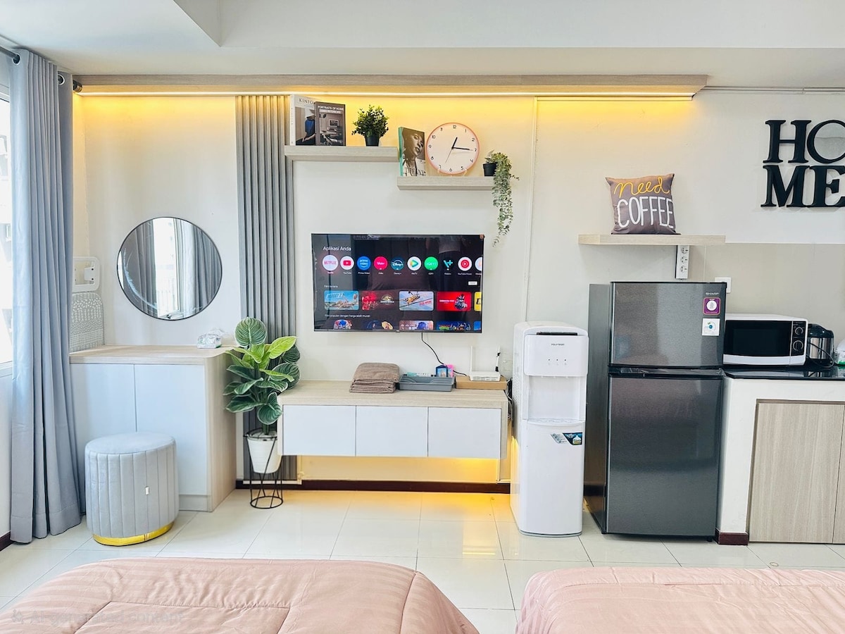 An elegant 24sqm studio in Jakarta's center, blending style and convenience. Includes kitchen, fast Wi-Fi, air-purification, 43" smart TV, sound system and Netflix. It is ideal for various stay types, with contactless access and amenities like pools, jacuzzi, gym, and basketball, Now features a Reverse Osmosis dispenser & food waste disposal, The picture shows a gas stove that has been replaced by an induction cooker (to follow the apartment guidelines for fire hazards)