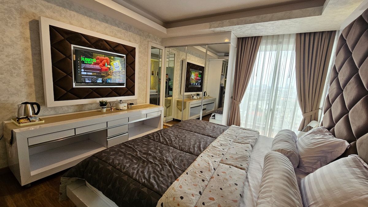 PLEASE READ FAST WIFI up 50 mbps NETFLIX Premium Vidio Premium This is 1 Bed Room Apartment converted into 2 Bed Room Setting. 3 Beds are 1 King Bed (180 x 200) 1 Twin Bed (140 x 190) 1 Sofa Bed (90) The location is just in the heart of PIK recreational location. Nearby: Pasar PIK Food Experience (day and night) Golf Island PIK Avenue Mall PIK Boulevard Batavia Cove Urban Farm Mangrove Sanctuary The Facilities: Convenient Store Beautiful Outdoor Swimming Pool Playground Gym Indoor Pool