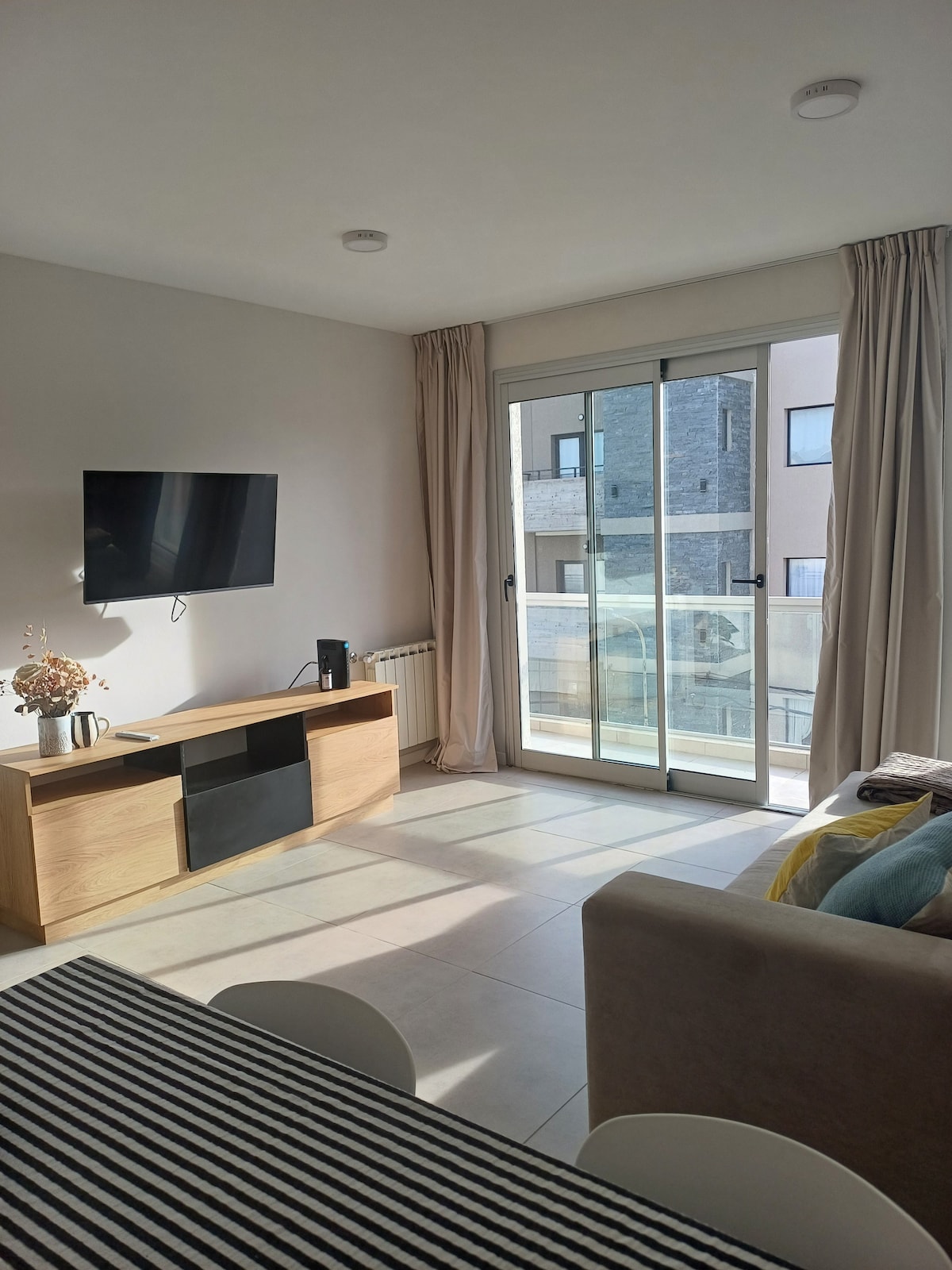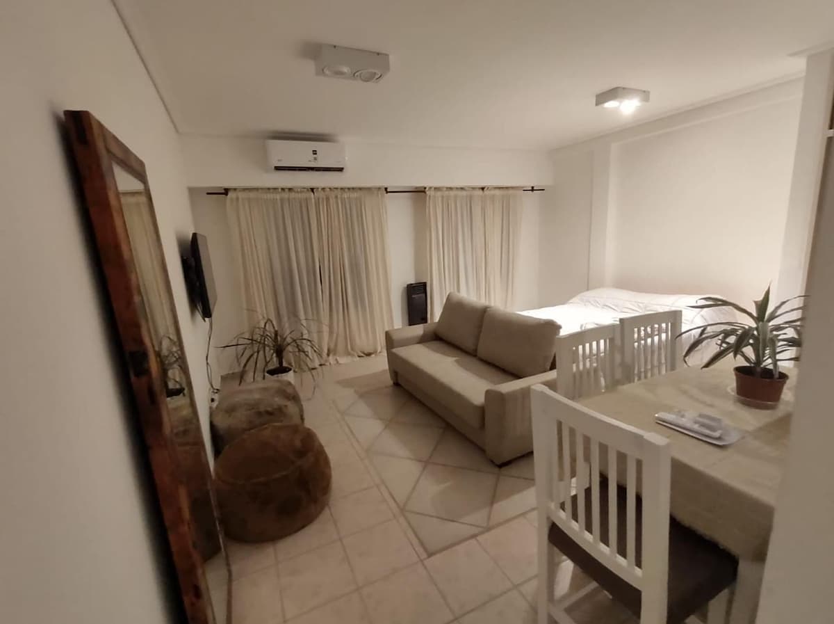 Disfruta de un espacio amplio y sereno. Encontraras confort, calidez y una estadia placentera con todo lo que necesitas. Sala con sofa y TV Smart de 55" y servicio de cable. Sector p trabajo. Heladera No Frost y los utensilios necesarios en la cocina y cafe, te y yerba para tus desayunos/meriendas. Dormitorio con sommier (2p) y ropa de cama. Baño completo con bidet y ducha con mampara. Calefacción por radiador que garantiza jornadas agradables en los dias frios de Tandil y cortina rollers.