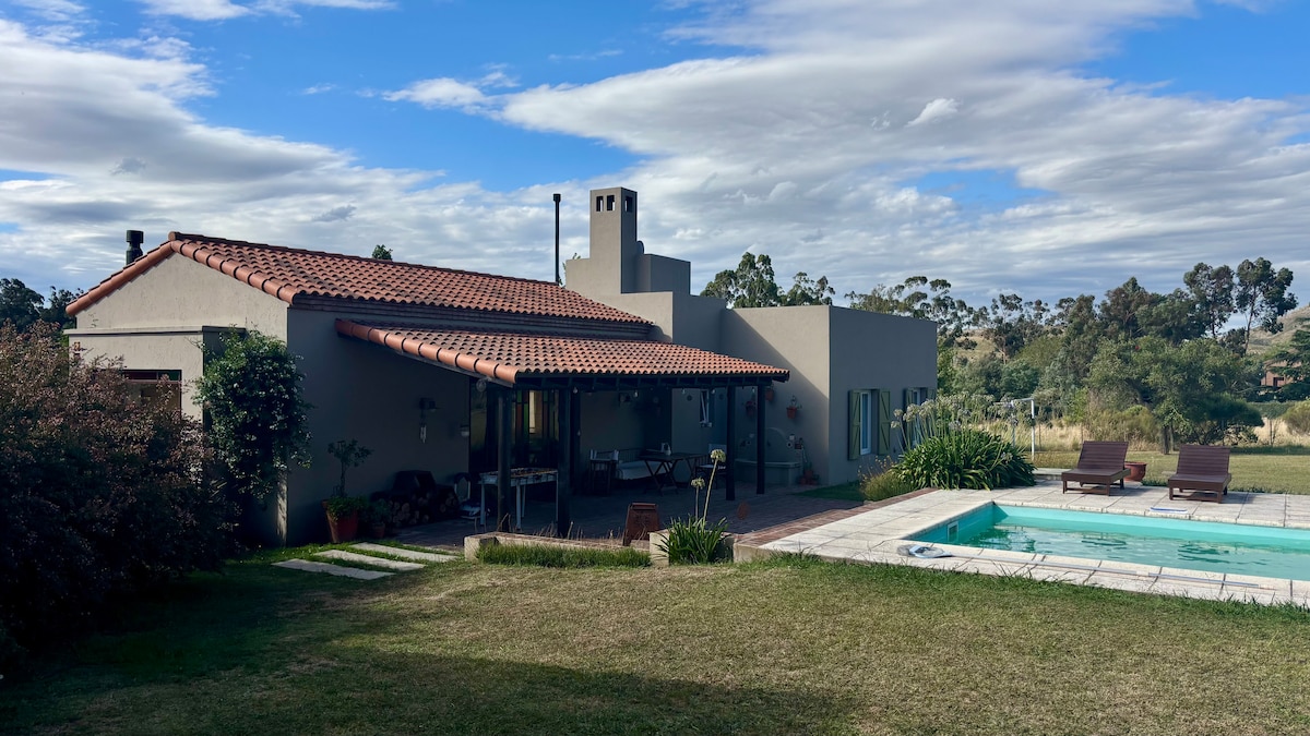 Una casa que ofrece desconectar de la rutina diaria y conectar con el entorno natural . Está Inmersa en un entorno verde donde se puede apreciar el sonido de diversas especies de aves y donde uno puede descansar la vista en un horizonte verde. Se encuentra a pocos minutos de senderos agrestes en las sierras y también a pocas cuadras de cafes de especialidad y comercios locales. Cada objeto que integra la casa fue elegido y cuenta una historia..