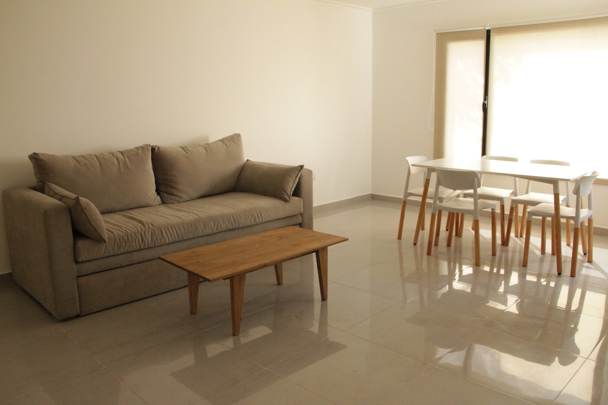Moderno y luminoso departamento de 2 ambientes, en primer piso por escalera, en zona céntrica y tranquila de Tandil. Con capacidad para 4 personas, cuenta con una habitación con cama matrimonial y un sofá marinero en el living. Espacioso, cómodo y bien equipado, ideal para descansar o recorrer la ciudad. Incluye cochera descubierta y excelente ubicación, a pocos minutos del centro y los principales puntos de interés.