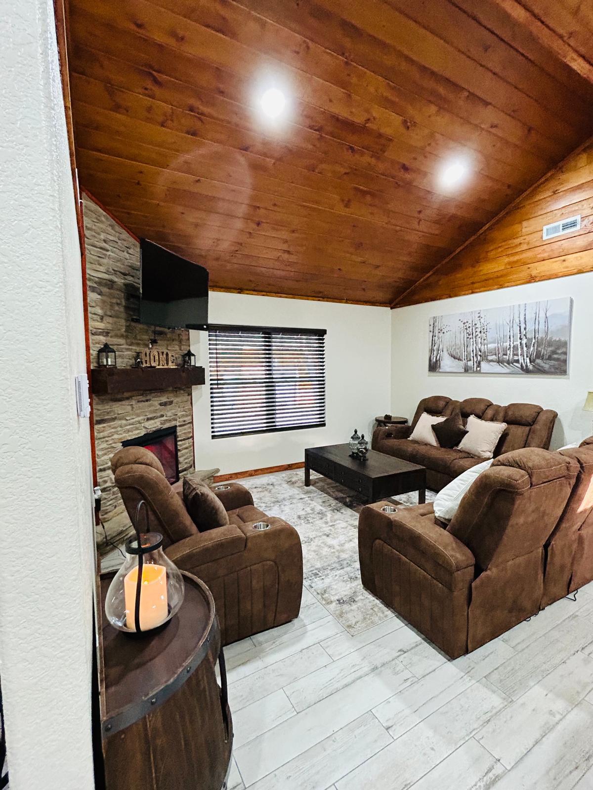 Relax and unwind in your own beautiful, peaceful cabin with a front row view of Lake Taneycomo’s bluffs. Watch the sun hit the bluff as it sets from the cozy fire pit, spacious deck or enclosed sunroom. Admire the authentic wooden canoe, and beautiful hand logged, rough sawn wood work while curled up in front of the fireplace.