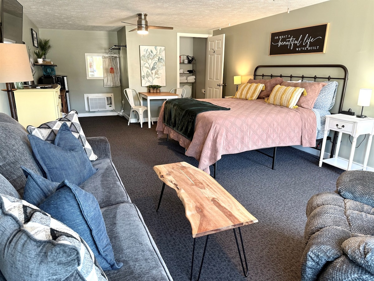 Take it easy at this unique and tranquil getaway cabin. Located at Beaver Creek Campground. Overlooking the peaceful river. One king size bed, as well as a small sofa that will easily sleep 2 kids, or 1 adult. Furnished with a small refrigerator, microwave, and Keurig. Everything is located in one spacious room, and the bathhouse (pictured) is down the trail. There is also a general store on property with all the essentials. It’s the perfect place to relax, and recharge.