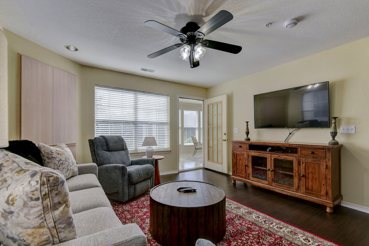 Find your bliss at this delightful 2-bedroom, 2-bathroom Branson vacation rental. Nestled within the Thousand Hills community, relax in your 1st-floor condo(stairs required) and kick back on the patio, soak in the hot tub, or splash in the community pool. Cozy up to the fireplace and pop on your favorite film or gather the crew for a game night. Tee up at Thousand Hills Golf Resort, enjoy a show at Dolly Parton's Stampede, or unleash your wild side at Branson's Promised Land Zoo.