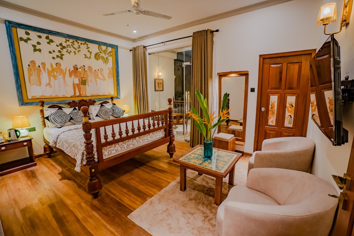 This ocean view suite offers laid-back luxury as natural light flows through the large windows to stir you awake at sunrise in this Weligama hotel room. A true highlight is watching the surf from your bed in a minimalist space awash with white walls and sea green tones. The suite includes a Marshall Bluetooth speaker, a desk and a mini fridge. The standard rate is for 2 persons, however it's possible to stay 3 with an extra bed at an additional charge of 50USD.