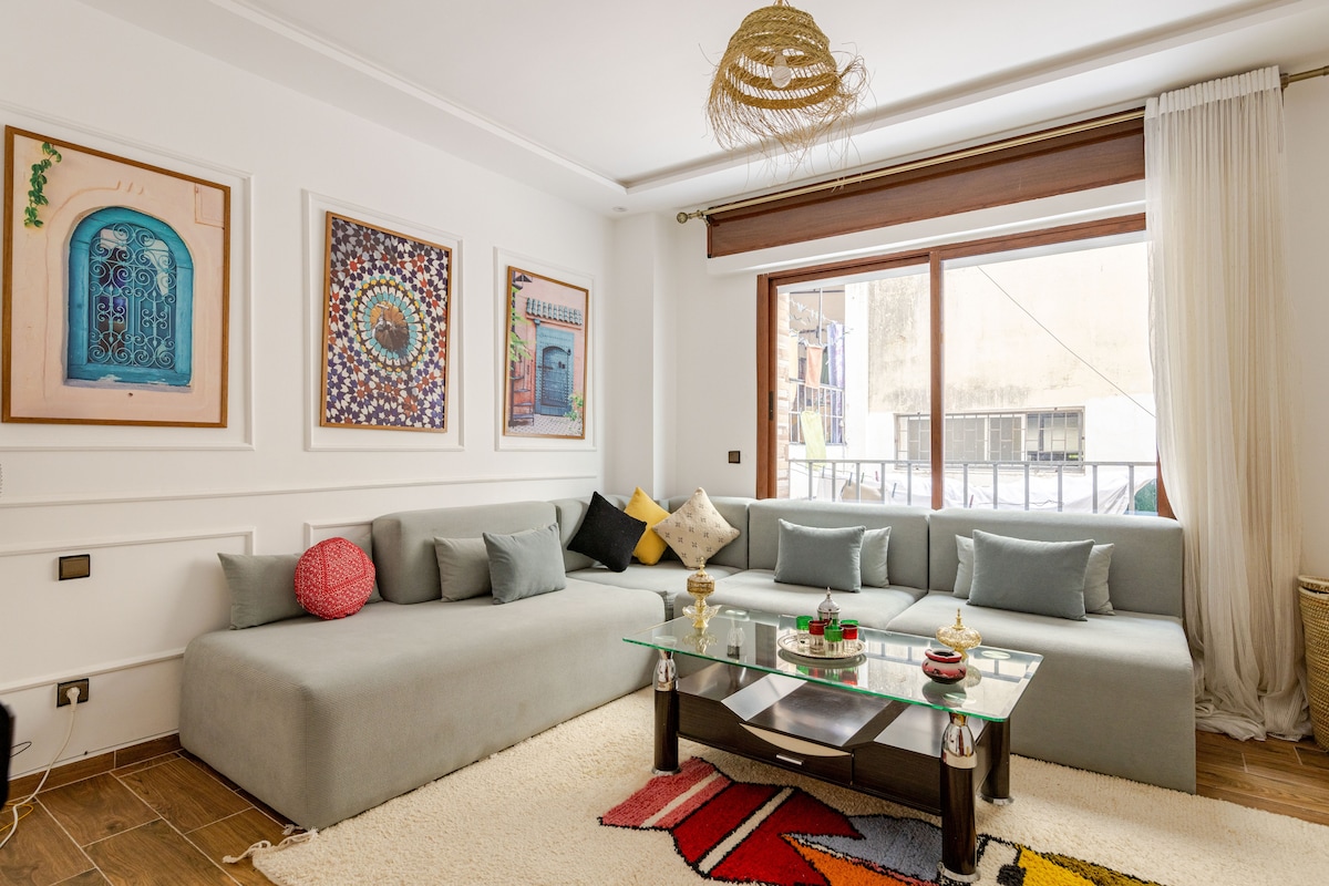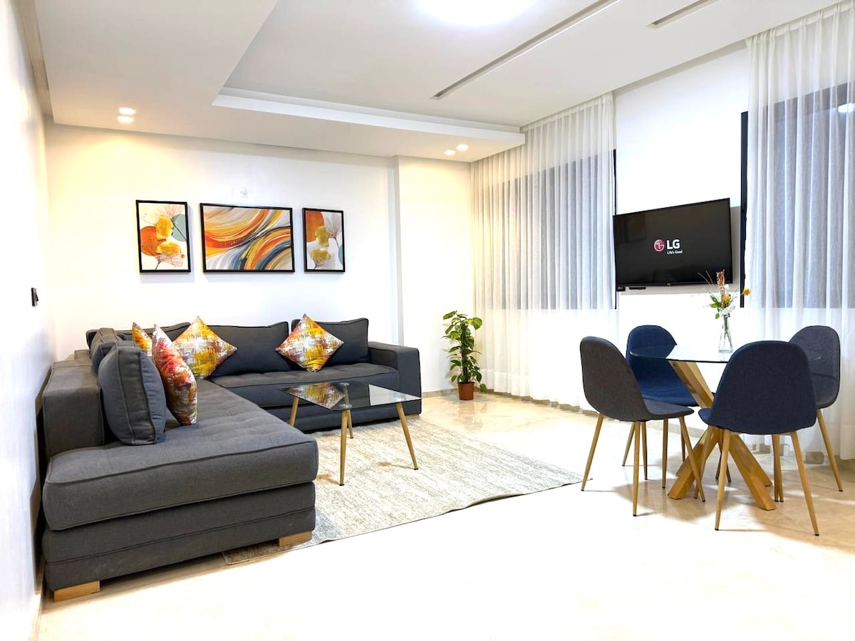 Welcome to our brand new two-bedroom apartment located in a prime area of Tangiers. This upscale property is situated in one of the most sought-after areas in the city with 24-H concierge & is only a 10 min walk from the Train Station, City Centre Mall, Ibn Battuta Mall and beaches. It offers both convenience and luxury at your doorstep. Private parking available. The apartment boasts: fibre optic WiFi, an option for chauffeur and a Moroccan breakfast prepared by our governess (additional cost)