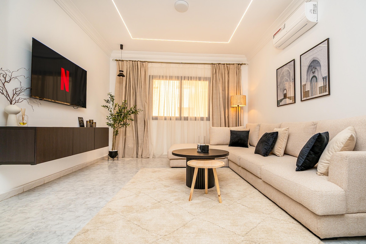 Located in the heart of Tangier, this apartment combines urban chic with coastal tranquility. Each carefully decorated room invites relaxation. The modern interior, featuring an American kitchen and an Italian shower, is designed for your comfort. Enjoy high-tech amenities such as centralized air conditioning, fiber optic Wi-Fi, Smart TV, and Netflix. Just steps away from the beach and the TGV station, City & Sea is a luxurious oasis.