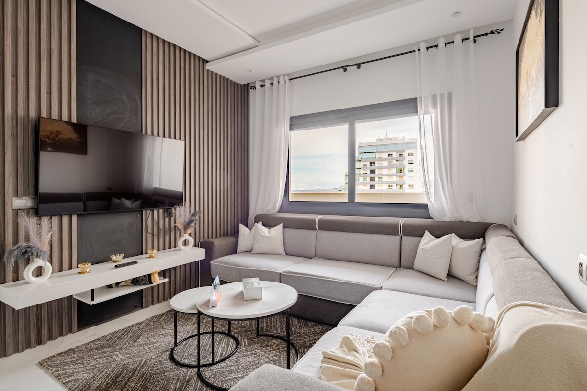 Vous êtes à la recherche d'un appartement moins cher qu'un hôtel. Découvrez cet appartement luxueux en plein centre-ville de Tanger et avec vue partielle sur mer, à 2 min de Marina ,près des cafés et boutiques ,du Mall Ibn Batouta ,de l'ancienne médina et monuments historiques .Le point de départ idéal pour explorer la ville. Cet élégant appartement d'une chambre, un salon ,une terrasse vue mer ,une cuisine américaine , un climatiseur , une WIFI , ( espace de travail ) , smart TV .