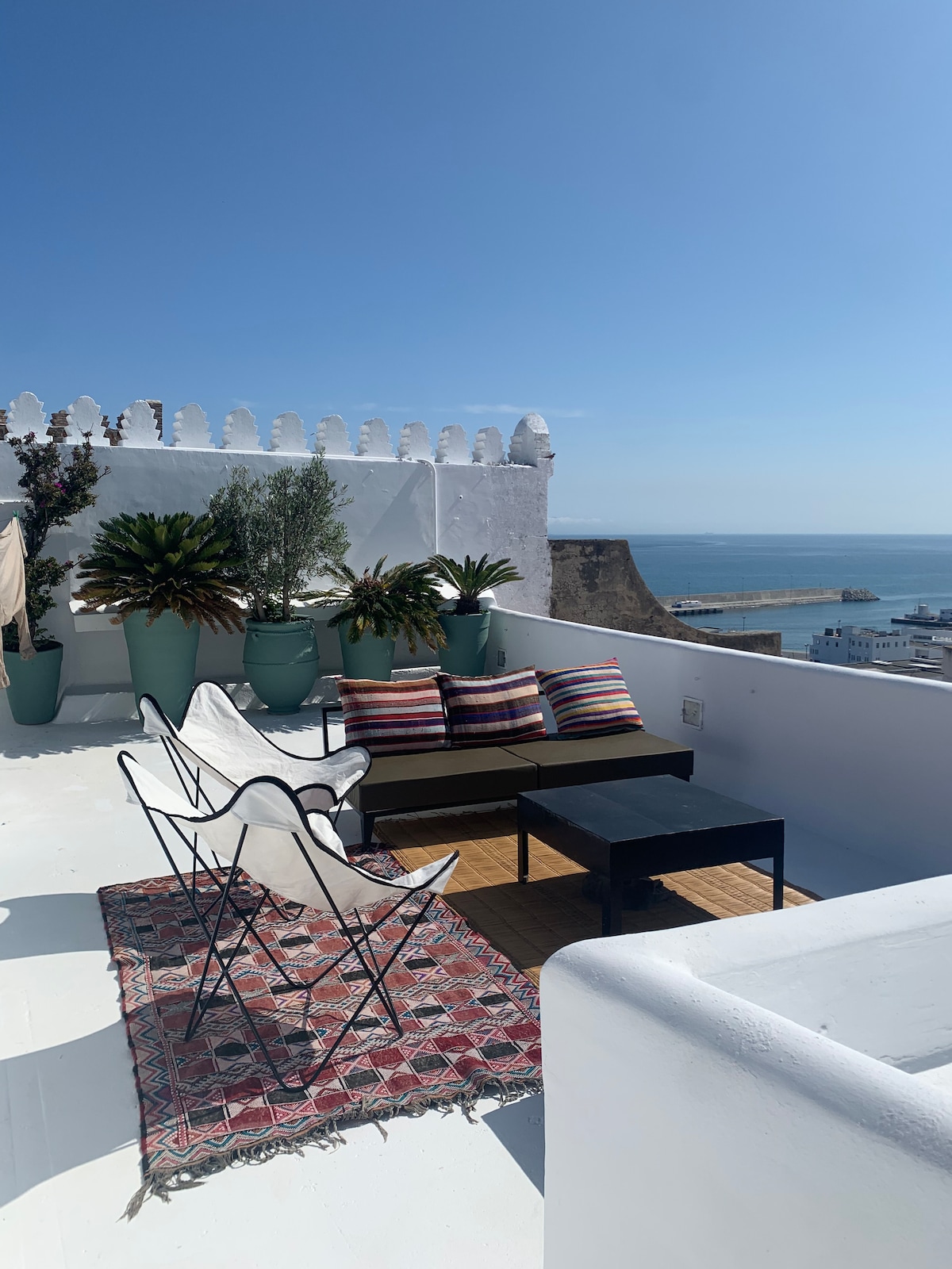 Riad Detroit offers stunning Mediterranean Sea views from every room, overlooking Tarifa, Spain, and the Strait of Gibraltar. Enjoy two balconies with breathtaking sea and beach views. This 300-year-old villa has been expertly remodeled with modern amenities. Centrally located on the Old Medina wall, it’s just a 5-minute walk to the Kasbah and Petit Socco. We assist with luggage due to stairs, common in traditional Riads. Let us make your stay unforgettable.