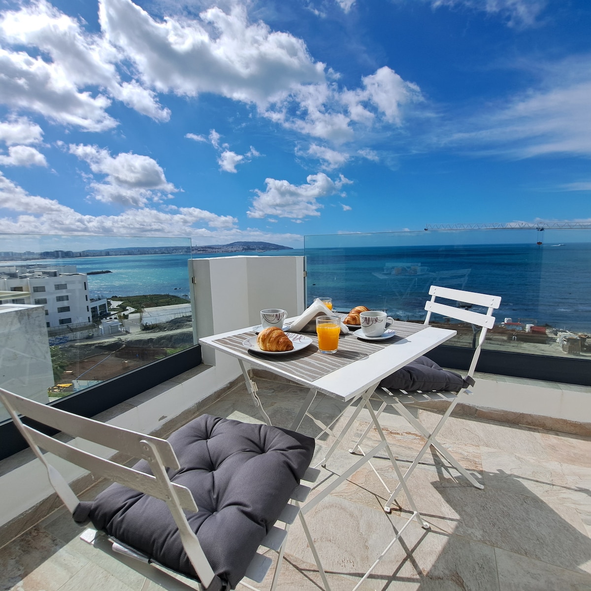 Modern 2-Bedroom Apartment in the Heart of Tangier This stylish 2-bedroom apartment in Tangier’s Marina Bay features a private balcony overlooking the sea and the Strait of Gibraltar. Enjoy a spacious living room, fully equipped kitchen, modern bathroom with marble finishes, and two comfortable bedrooms. Walk to the beach, cafés, and marina promenade. Perfect for couples, families, and travelers seeking a unique Europe-meets-Africa stay.