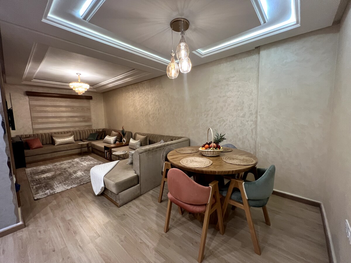 Welcome to our charming 3-bedroom apartment nestled in the vibrant heart of Tangier's hyper center. All necessary amenities are available: Air-conditioning, Smart Tv, Netflix, fiber-optic internet connection, coffee machine, towels, shower amenities, etc Located on the last floor of the building with elevator access, you are just a few stairs away to access the incredible rooftop and admire breathtaking views of Tangier, Spain, the straits of Gibraltar and the mountains of Chefchaouen.