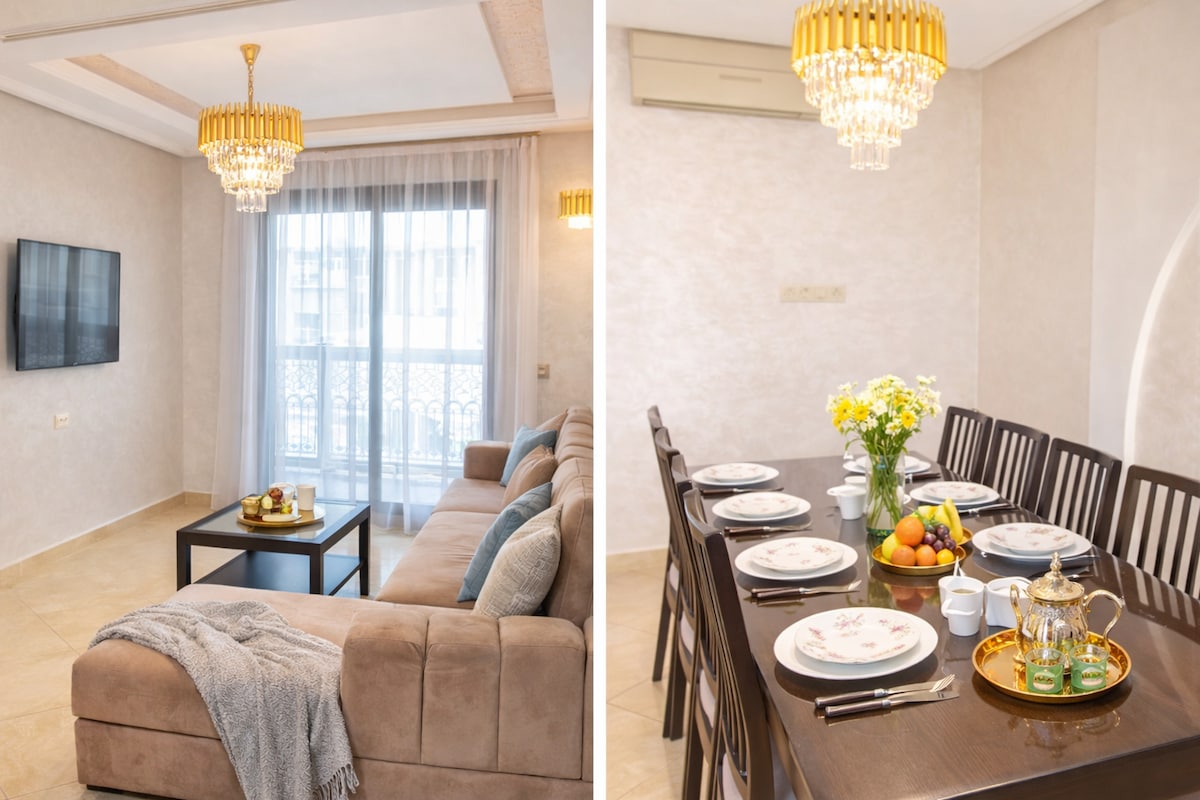 This charming luxury apartment is located in the heart of Tangier’s Mesnana Golf area Enjoy fast Wi-Fi, free parking, and handcrafted Moroccan decor that adds a warm, and giving the space a soulful Moroccan touch,Just 5 minutes from the beach, forest, and surrounded by cafés, luxury restaurants, and supermarkets. Located on a main road with easy transport access This apartment is ideal for couples, families, or anyone looking to explore Tangier while enjoying a peaceful and stylish home base.
