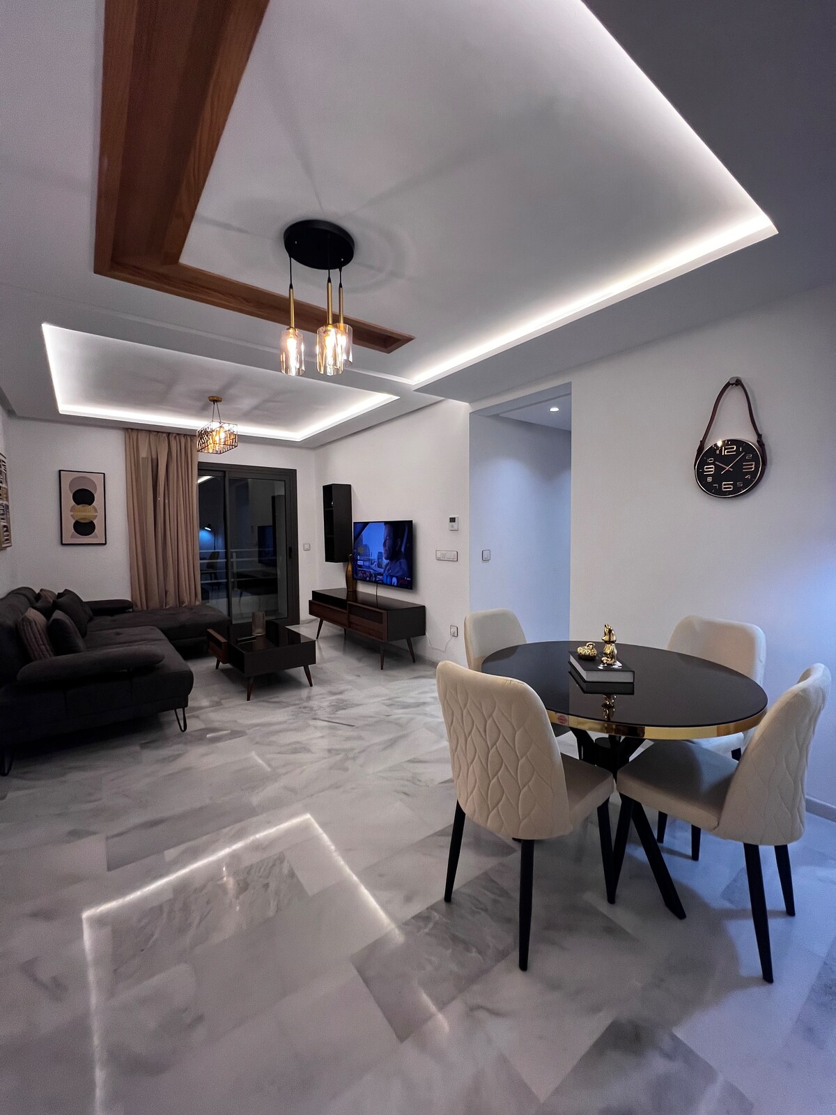 Venez vivre une expérience unique dans cet appartement de luxe, où le confort moderne et traditionnel se marie avec le charme de Tanger. Situé en plein cœur de la ville, cet espace élégant vous offre une atmosphère raffinée, idéale pour explorer les merveilles de Tanger. Vous êtes assuré d'un séjour mémorable. L'appartement à quelques pas des principales attractions, restaurants et boutiques locales, il constitue l’endroit parfait pour se détendre après une journée bien remplie.