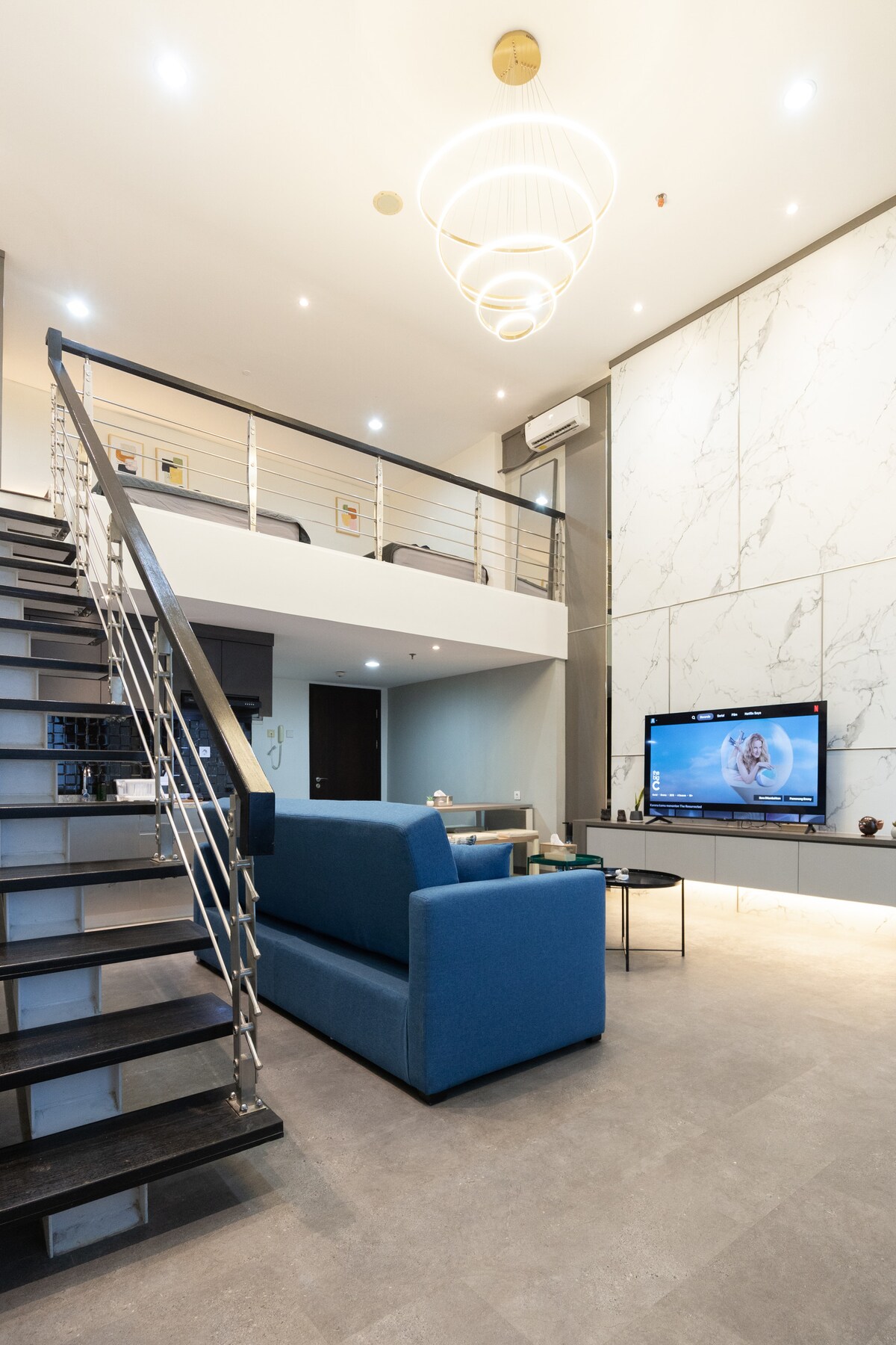 Our Brand New SOHO offers a spacious, fun, and cozy loft for groups — perfect for Hangout, Cozy Staycation, and Creative Work trips 🎉 ▪︎ 95 sqm loft | 2 floors ▪︎ 2 large tables ▪︎ 65” Google TV | Fast WiFi ▪︎ Comfy beds (😉 we take pride in them) + Games ▪︎ Full Kitchen Located in Central Alam Sutera — everything is within reach ✨ Enjoy 🎾 morning sports, ☕️ café hopping, 👗 shopping sprees at boutiques & big malls, or simply recharge with ☘️ slow walks or spa Live-work-play effortlessly 🌸
