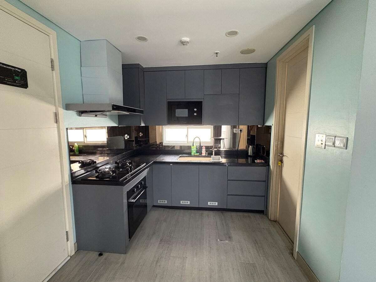 A spacious, cozy 1-bedroom apartment with a living room and balcony at Citralake Suites, West Jakarta's ideal lakeside getaway. Conveniently located just minutes from the Airport, PIK, Puri Indah and Sunset Avenue, it’s easy to explore the city. Step outside and you’re just a 1-min walk from Ciffest, a lively dining area with plenty of food options, supermarkets and ATMs. Our 1 BR unit provides a luxurious and comfortable space for up to 3 guests, with a kitchenette, Free Wi-Fi, and Netflix.