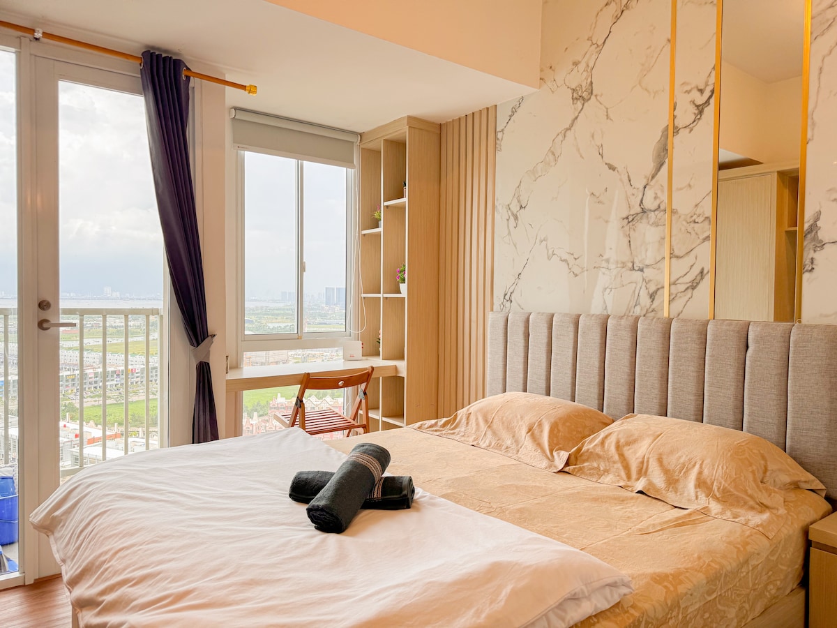 Experience a cozy minimalist escape at Tokyo Riverside PIK 2, where modern design meets comfort. Perfect for solo travelers or couples, this stylish studio offers a queen bed, kitchen, smart TV, and Wi-Fi — ideal for work or rest. Just a 1-minute walk to an open-air mall, supermarket, and 90+ cafés and restaurants, with Aloha Pantai Pasir Putih, Pantjoran PIK, NICE PIK 2, and more nearby. Clean, comfy, and convenient — your perfect stay near the airport.