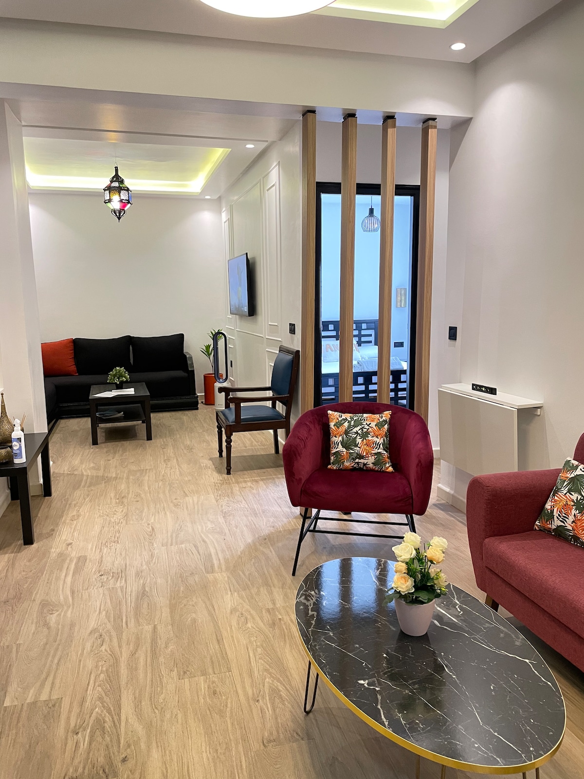 MERCI DE LIRE AVANT DE RESERVER Pour une expérience unique à Tanger, nous vous proposons cet appartement élégant aux couleurs sobres et épurées, en plein cœur de Tanger. A quelques pas des endroits branchés de Tanger, venez profiter du confort qu'offre cet appartement. Remarques importants: - Appart au 3ème étage SANS ASCENSSEUR. - Appart destinée uniquement à une clientèle familiale ou COUPLE MARIÉ et les amis non mixte.