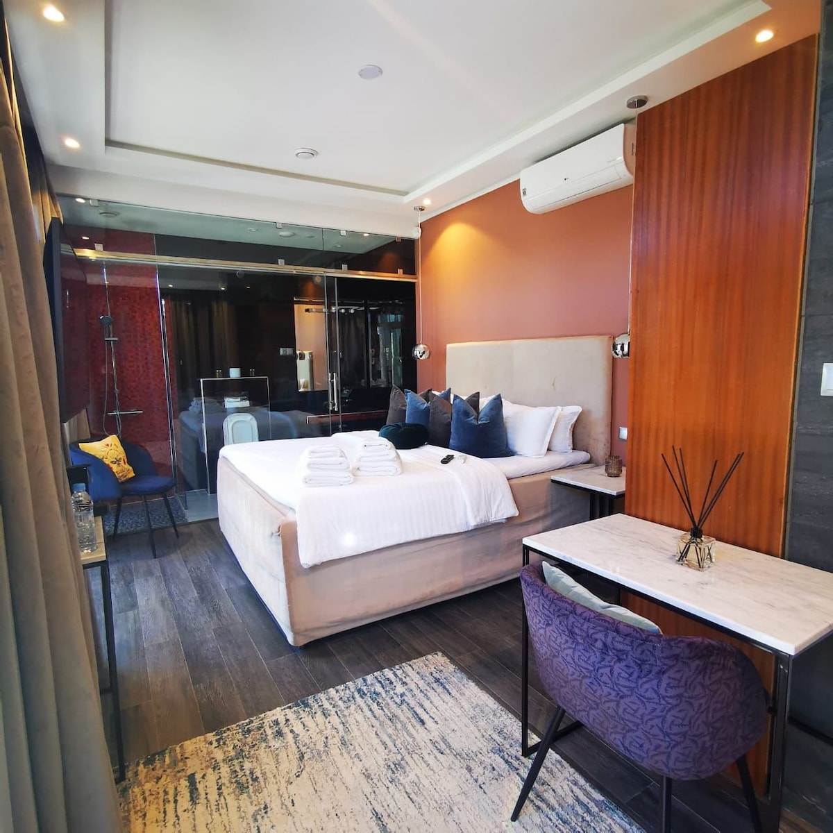 Savanna sunset room with ocean and pool view. This stylish and unique place sets the stage for a memorable trip. Try something different and live the Scandinavian life style. This room features a calming Savanna sunset colour and exclusive interior. The room includes a Nespresso-machine, satellite-TV and an air conditioner to ensure a perfect temperature. The bed is a queen-size suited for two adults. In the bathroom you will find towels, a hairdryerand free toiletries.