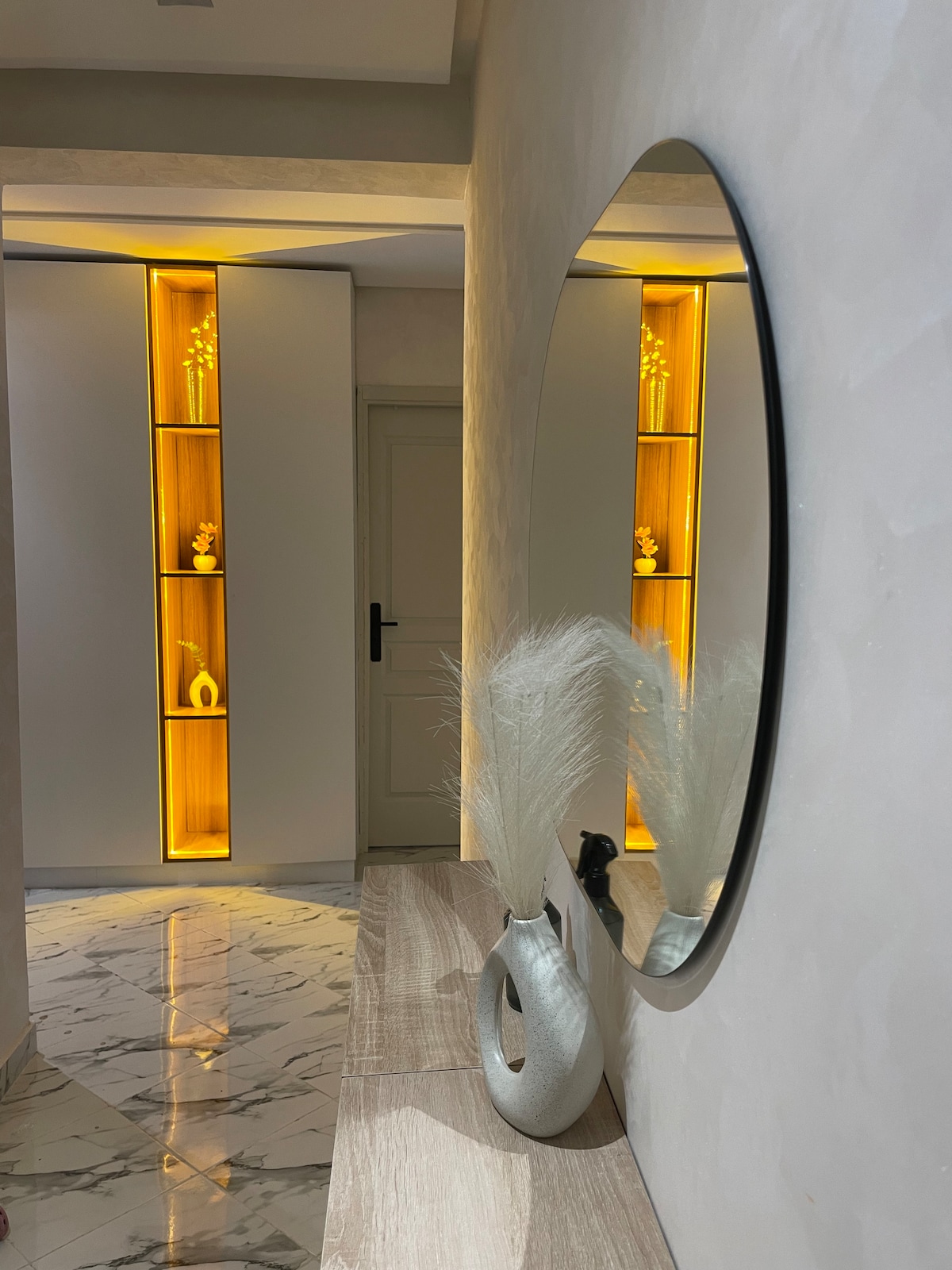 Welcome to our luxurious two-bedroom, two-bathroom apartment located in the prestigious Burj Al Andalous in Tangier. This upscale property is situated in one of the most sought-after areas in the city with 24-H concierge a few minutes walk from the Train Station, City Mall, beautiful beaches, and high-end hotels, offering convenience and luxury at your doorstep. We offer premium services: fibre optic WiFi. Chauffeur and a traditional Moroccan breakfast by our local governess (additional cost).