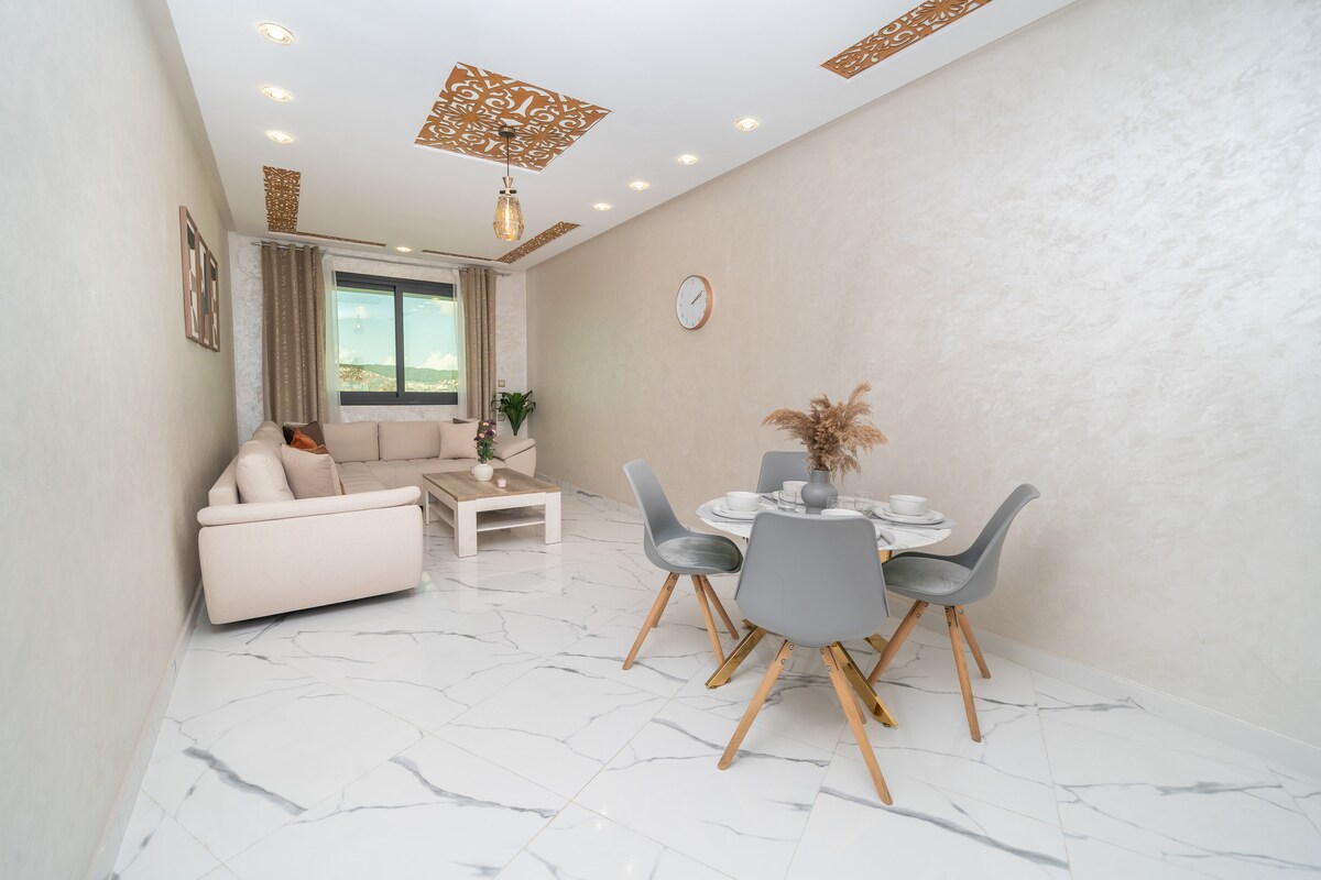Ashraf Home offers an exceptional luxury stay in a modern and refined apartment within secure residence with private Parking. Appart Recently renovated and tastefully furnished, it delivers premium comfort,Wi-Fi🛜,Ideally located, close to beaches, shops and cafes, 8 minutes from the airport, 2 min from the Grand Stadium, 5 min from Achakar Beach🌊 and 11 min from the city center. The features two spacious living rooms, a fully equipped kitchen, Bathroom and two elegant bedrooms, Book now ! 🎉