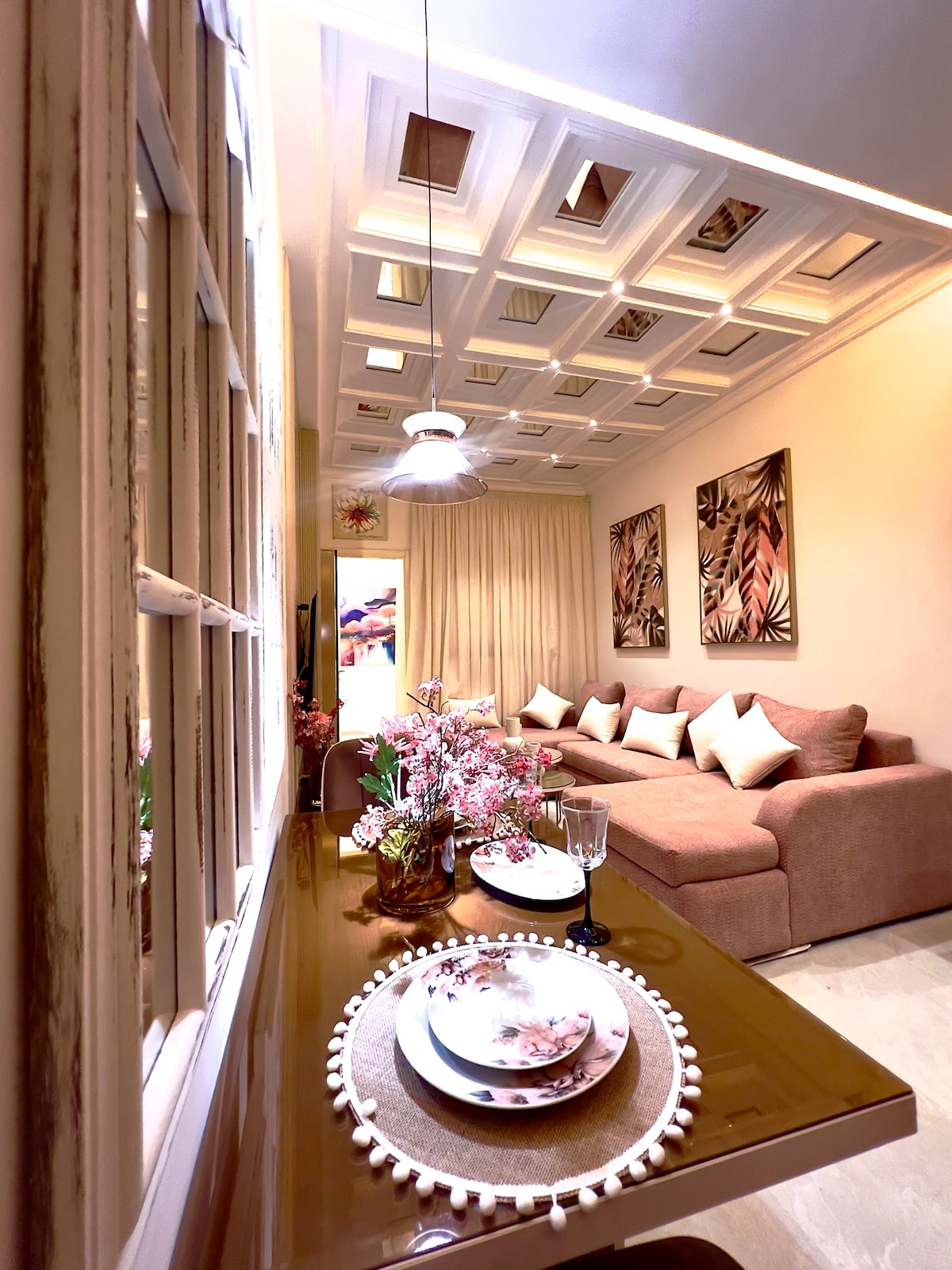 Bienvenue dans notre Moderne Appartement à 2 pas de la plage 🏖️, idéal pour familles ou amis. -Chambre parentale avec lit standard et vue mer 🛏️. -Deuxième chambre avec deux lits 90cm une personne, vue mer. -Salon moderne et lumineux 🛋️ avec vue mer. -Balcon ensoleillé 🌅 vue sur mer. -Cuisine américaine moderne et équipée 🍴. -Calme, raffiné et proche des commodités : cafés, restaurants et promenade. Parfait pour un séjour inoubliable à Tanger.