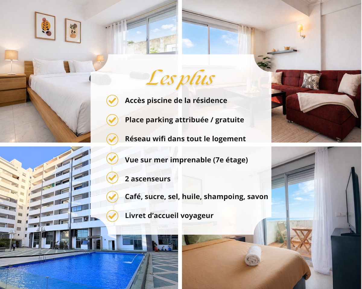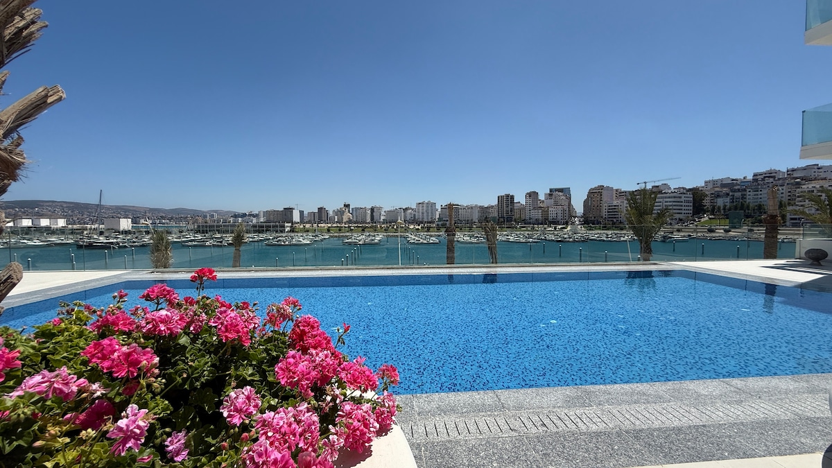 Wake Up to Ocean Views! 🌊 Chic Apt in Heart of City 📌Unbeatable location! Under 10 min walk to Medina (old town) and 10 min to the beach Stylish 100m² apt with ocean views from every room, terrace & balcony Central yet peaceful. Marble floors & art-filled Amenities: 🅿️ Parking, 🏊 Pool, 🔒 24/7 Security Walk to: 🏖️ Beach – 10 min walk 🏰 Medina/Kasbah – 8/15 min walk ⚓ Marina Bay/Port – 10 min walk 🍽️ Restaurants, cafes, supermarket & shops downstairs 🚀 Fast WIFI, 📺 2 TVs, 🎬 Netflix