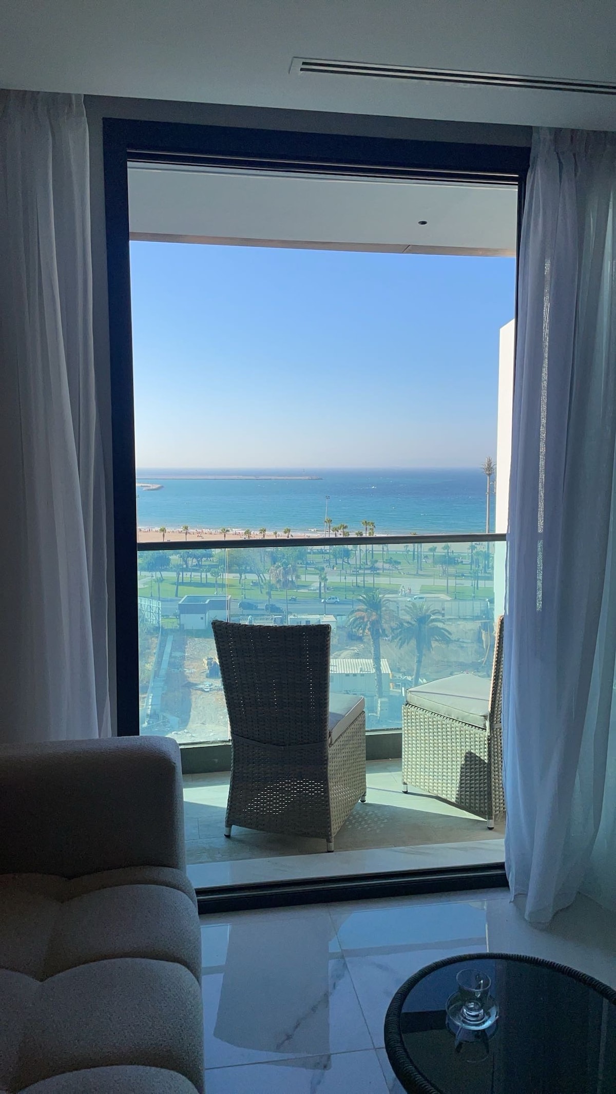 Très joli studio meublé moderne en plein centre ville avec une vue splendide sur mer se trouve à 2 pas de la plage , Hilton , la gare TGV . vous pouvez même tout faire à pied. Cuisine bien équipée( réfrigérateur, four, machine à laver, chauffe-eau…)Salle de bain avec douche italienne. IP TV. Climatiseur. Parking souterrain avec l accès direct à l appartement. Ce joli studio offre tout le confort et entouré de tout ce dont vous avez besoin pour passer des vacances mémorables