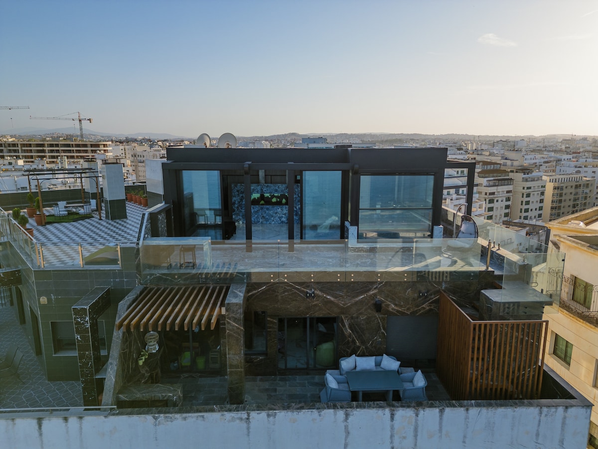 Luxury Penthouse with Panoramic Views of the Bay of Tangier Experience the ultimate in coastal luxury from this stunning three-bedroom, three-bathroom penthouse overlooking the Bay of Tangier, the Old Medina, and the Marina. Inside, every detail is designed for comfort and sophistication from the custom marble waterfall and floor-to-wall marble bathrooms, to the Jacuzzi spa and premium flooring throughout.