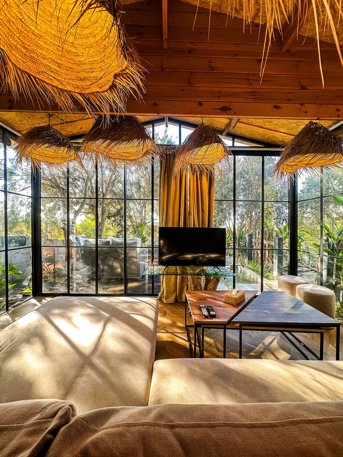 Discover a hidden gem in the heart of nature at La Finca, Tangier. This wooden cabin offers a unique blend of comfort and tranquility, with one bedroom, a sunlit bathroom featuring a glass-enclosed shower and tub, and a stylish living room. Surrounded by lush greenery and boasting two outdoor seating areas, it’s the perfect spot to unwind. Cool off in the small basin, relax under the trees, or enjoy the nearby beach just minutes away. Ideal for couples or solo adventurers seeking a peaceful.