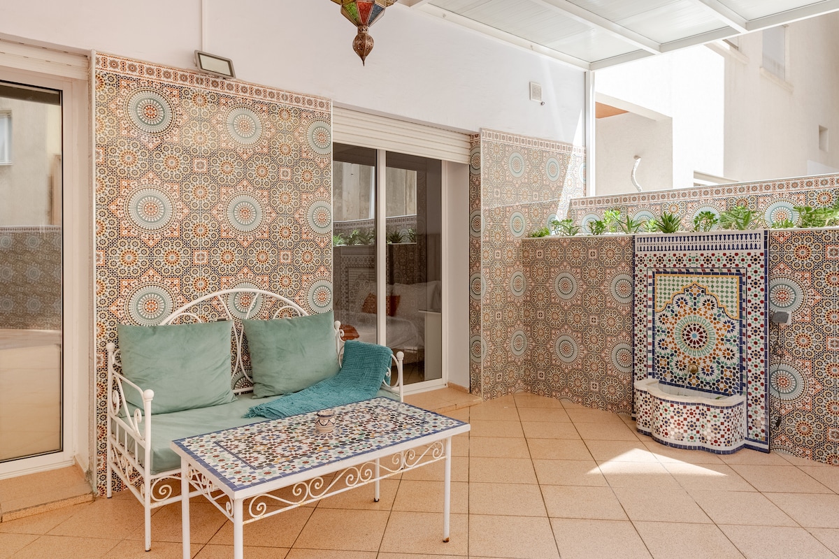 Centrally located one-bedroom apartment , just 350m away from the beach. The apartment features a comfortable living room, a well-equipped kitchen, and a shower. But the highlight of the apartment is our huge partially covered terrace with an authentic Moroccan zelige. Our apartment is situated in a prime location near the train station, City Center mall, making it the perfect base to explore the city. If you need an airport transfer, we can arrange for our taxi driver to pick you up.