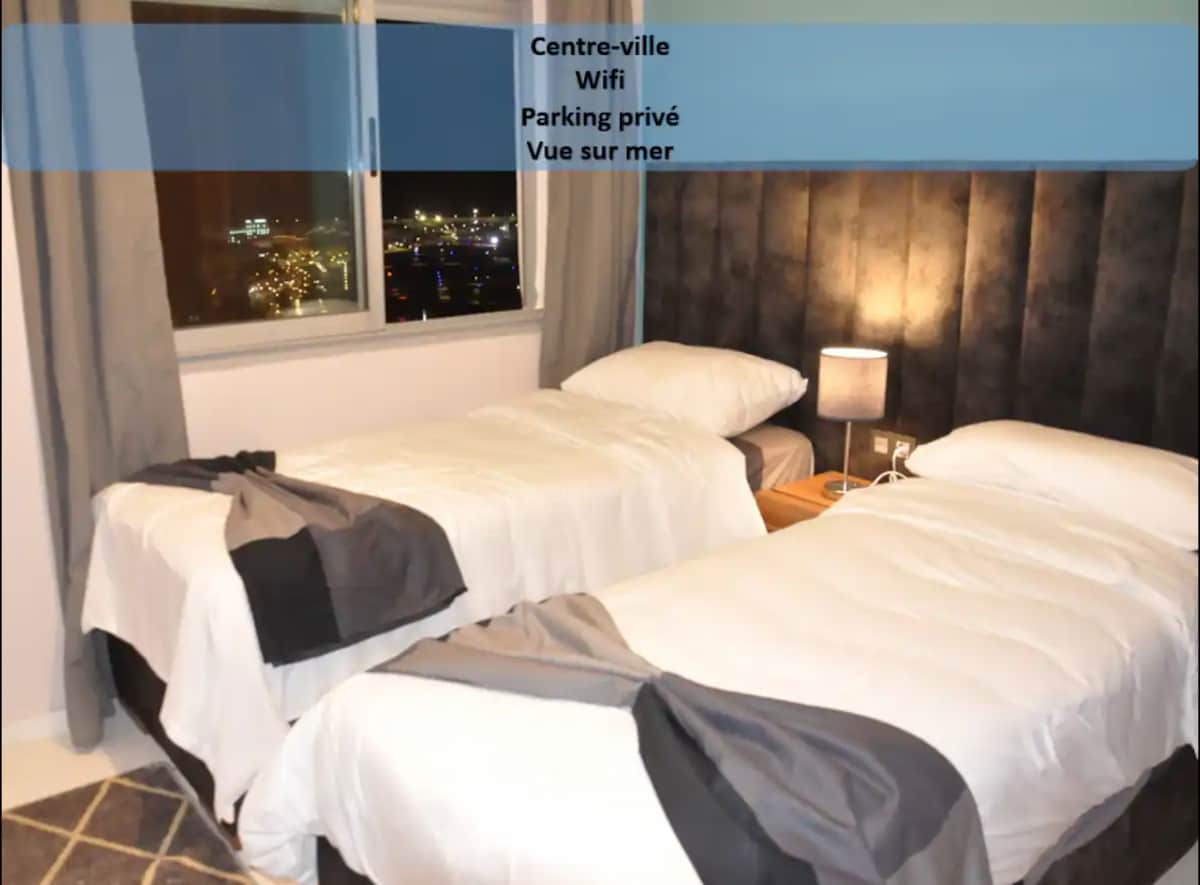 Vous êtes à la recherche d'un appartement moins cher qu'un hôtel. Découvrez cet appartement luxueux en plein centre-ville de Tanger et avec vue partielle sur mer, à 2 min de Marina ,près des cafés et boutiques ,du Mall Ibn Batouta ,de l'ancienne médina et monuments historiques .Le point de départ idéal pour explorer la ville. Cet élégant appartement d'une chambre, un salon ,une terrasse vue mer ,une cuisine américaine , un climatiseur , une WIFI , ( espace de travail ) , smart TV .