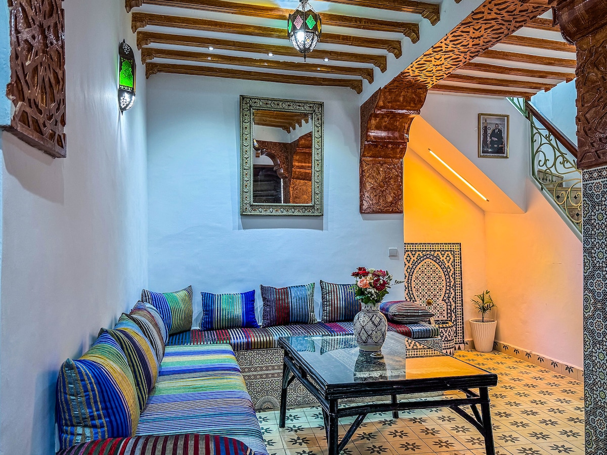 Arous Chamel est un authentique Riad du 18°siècle entièrement restauré en conservant son style original,situé en plein coeur de la vielle médina de tanger il dispose d'une superbe terrasse avec vue sur mer et sur la ville pour prendre votre petit déjeuner marocain