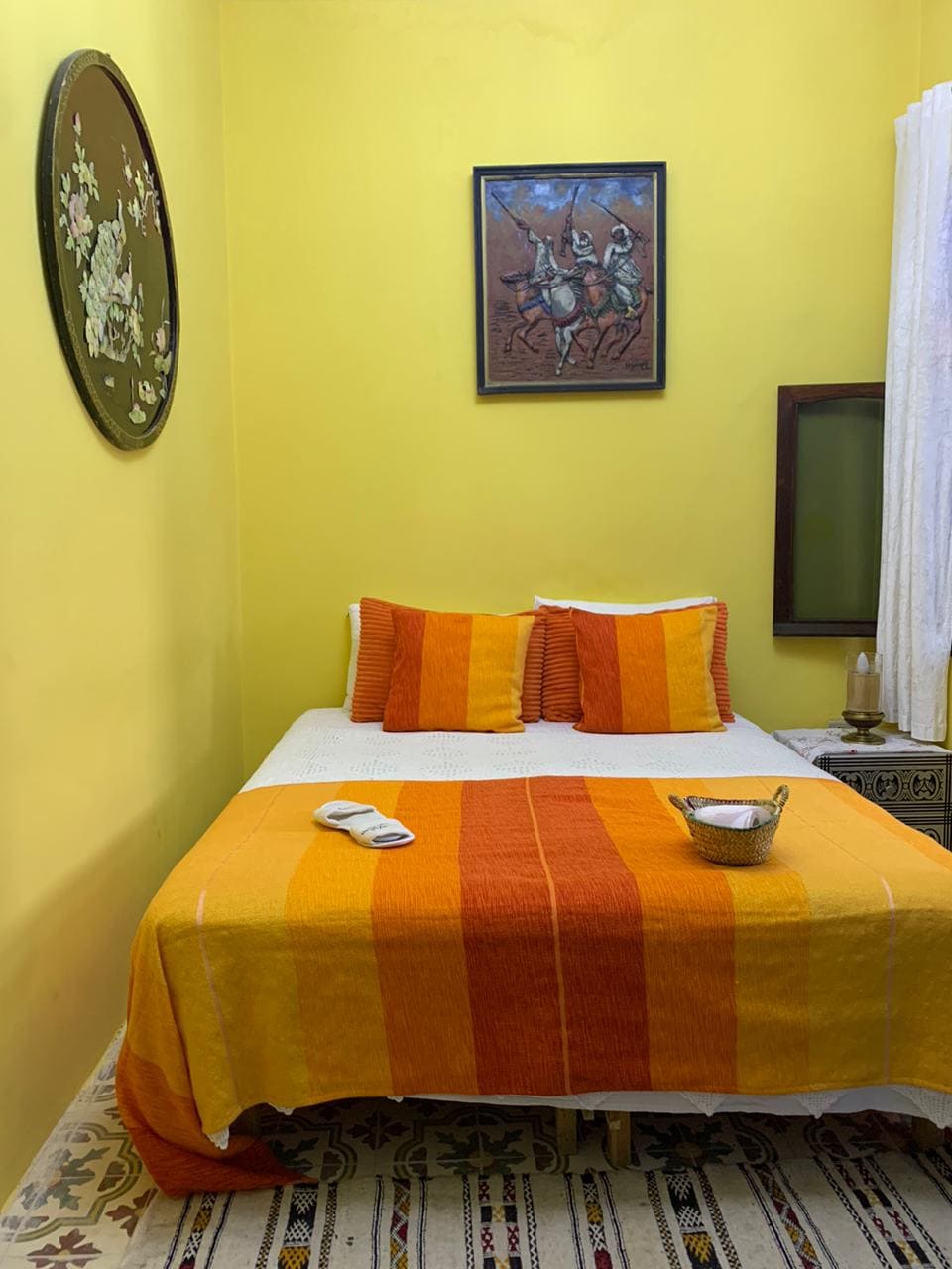 This comfortable room is located in the heart of Tangier's historic Medina. It features a queen-size bed, perfect for two people, with bed linen, a private bathroom, fresh towels, shampoo, makeup remover, cotton pads, and a hair dryer provided, free breakfast. Guests can enjoy a shared, fully equipped kitchen and a rooftop terrace with great views. The beach is just a 15-minute walk away, and the city's best restaurants, museums, and markets are only 5 minutes from the door.
