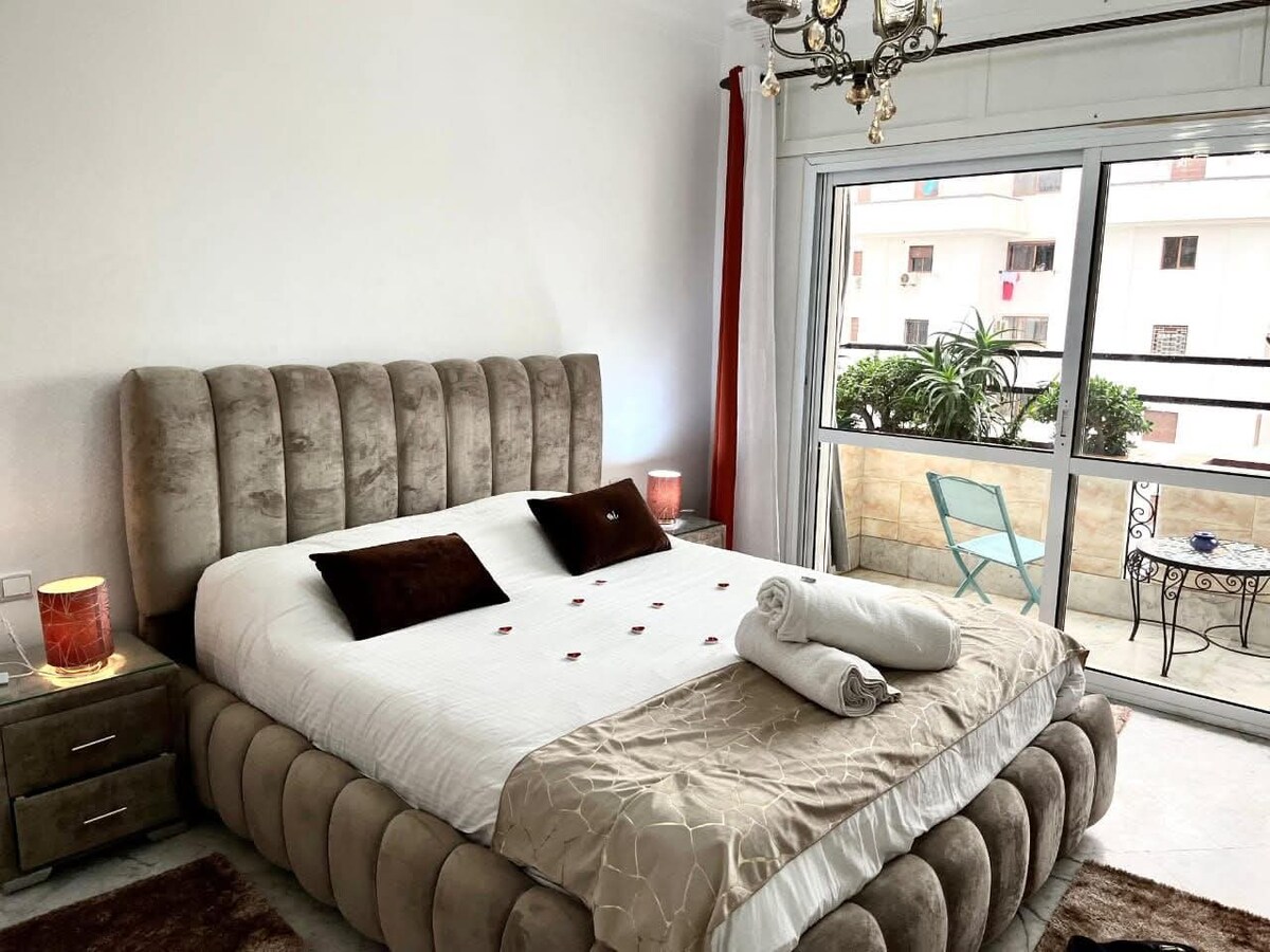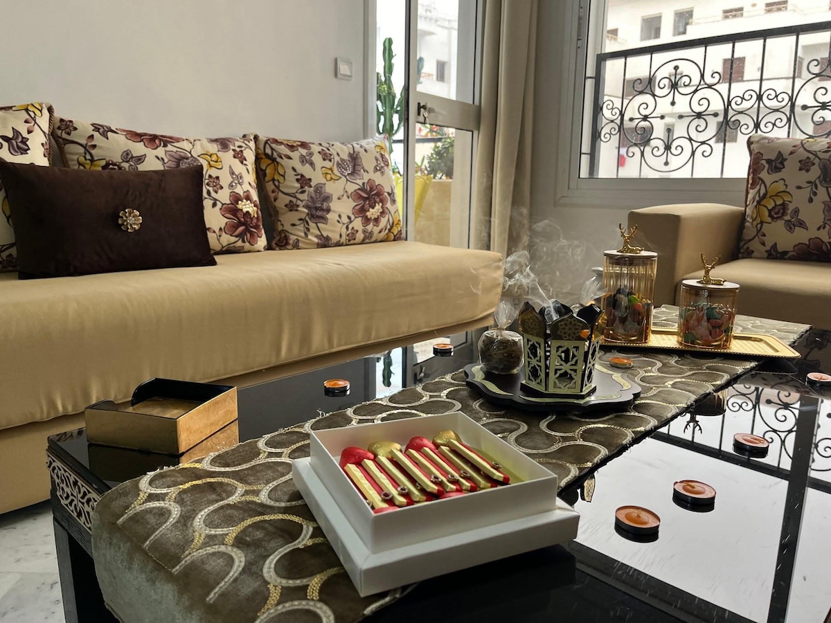 Bienvenue dans notre Moderne Appartement à 2 pas de la plage 🏖️, idéal pour familles ou amis. -Chambre parentale avec lit standard et vue mer 🛏️. -Deuxième chambre avec deux lits 90cm une personne, vue mer. -Salon moderne et lumineux 🛋️ avec vue mer. -Balcon ensoleillé 🌅 vue sur mer. -Cuisine américaine moderne et équipée 🍴. -Calme, raffiné et proche des commodités : cafés, restaurants et promenade. Parfait pour un séjour inoubliable à Tanger.