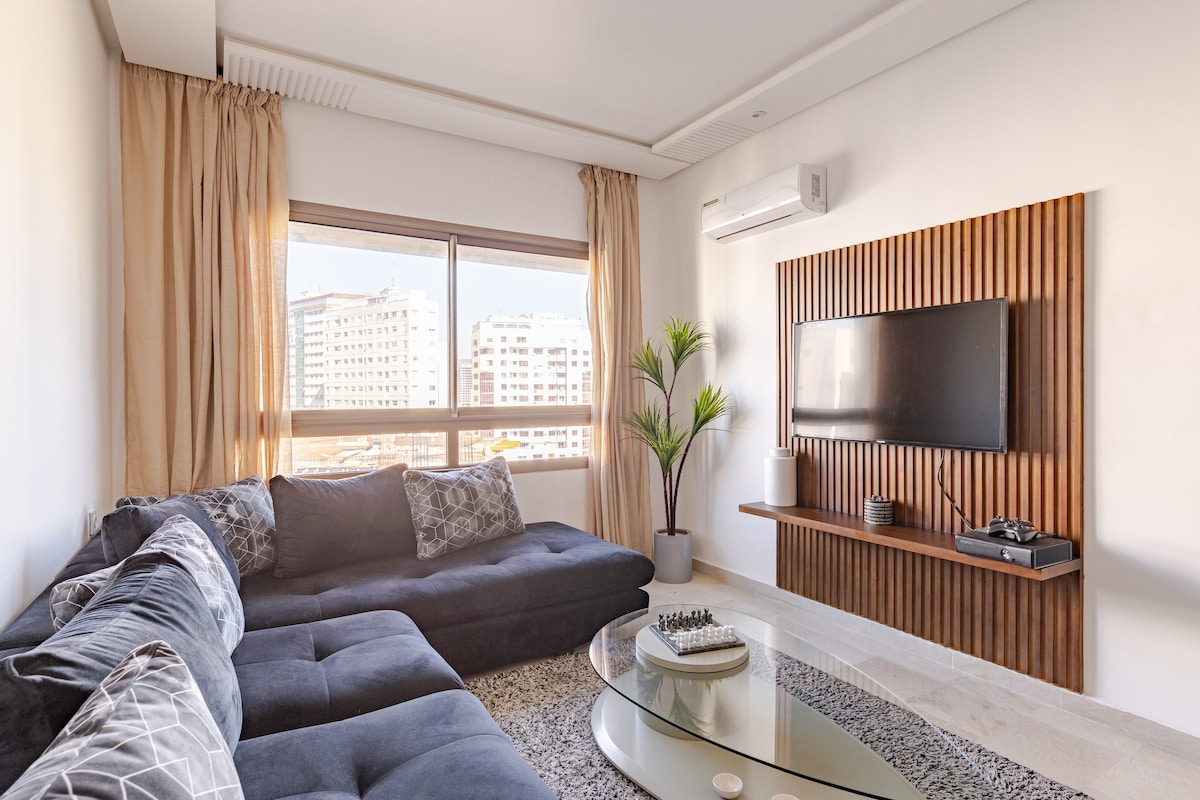 Welcome to our charming 3-bedroom apartment nestled in the vibrant heart of Tangier's hyper center. All necessary amenities are available: Air-conditioning, Smart Tv, Netflix, fiber-optic internet connection, coffee machine, towels, shower amenities, etc Located on the last floor of the building with elevator access, you are just a few stairs away to access the incredible rooftop and admire breathtaking views of Tangier, Spain, the straits of Gibraltar and the mountains of Chefchaouen.