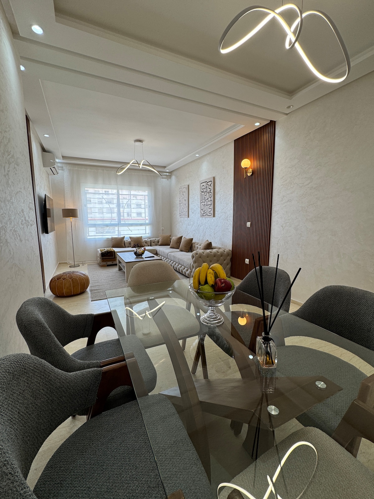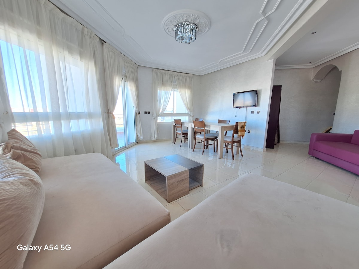 central (à côté du boulevard Mohamed 5) , élégant et design , la meilleure zone proche de toutes les commodités. Dans une résidence privée avec sécurité 24h/24,Composé de 2 chambres, grand salon avec salle à manger, cuisine, 1 salle de douche, GRANDE Terrasse avec une vue spectaculaire sans vis à vis ,ascenseur, bien meublé et équipé de tout le confort pour rendre votre séjour agréable. À 2min de la Marina de tanger, 20 min de l'aéroport, et 2min de la gare Tgv -pickup airport en option
