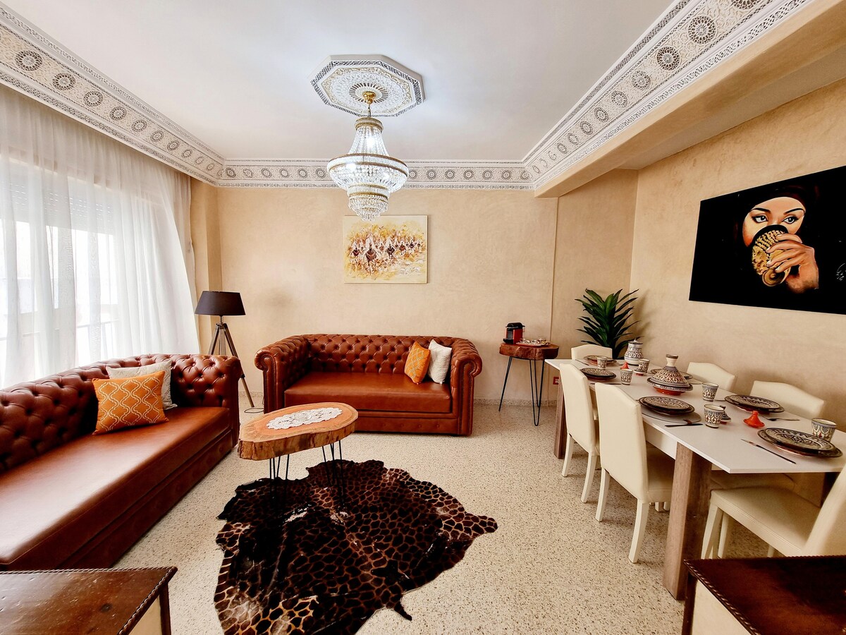 This charming luxury apartment is located in the heart of Tangier’s Mesnana Golf area Enjoy fast Wi-Fi, free parking, and handcrafted Moroccan decor that adds a warm, and giving the space a soulful Moroccan touch,Just 5 minutes from the beach, forest, and surrounded by cafés, luxury restaurants, and supermarkets. Located on a main road with easy transport access This apartment is ideal for couples, families, or anyone looking to explore Tangier while enjoying a peaceful and stylish home base.