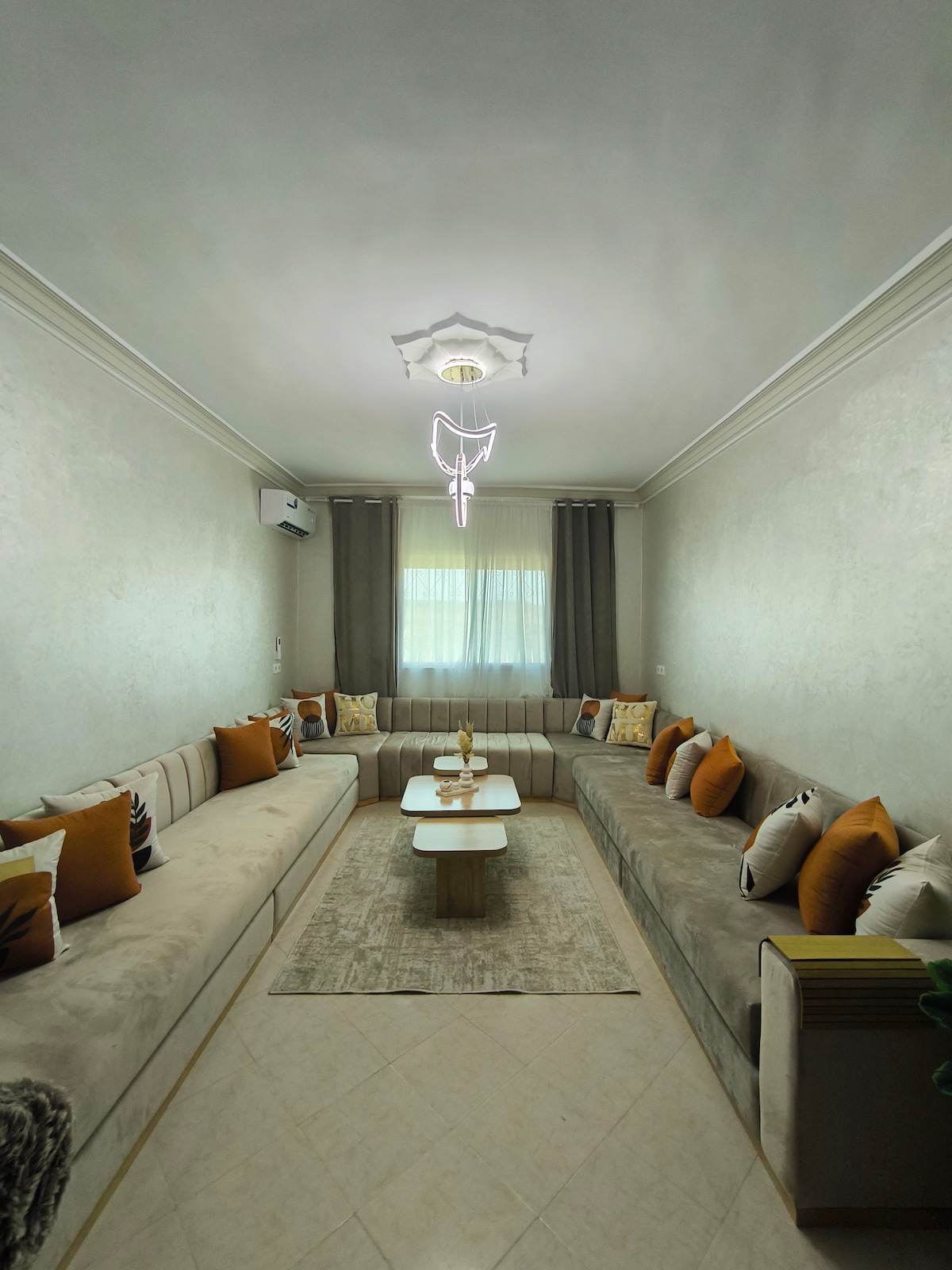 Welcome to HomeDarna — your peaceful, stylish retreat in Tangier. This beautifully renovated and fully furnished apartment offers comfort, convenience, and memorable experiences — perfect for families, friends, and business travelers. With a large private terrace, free parking, and a fantastic location close to both the airport and Grand Stade de Tanger, your adventure in Tangier starts here. The large terrace is one of the standout features of this listing, perfect to enjoy the sunset.