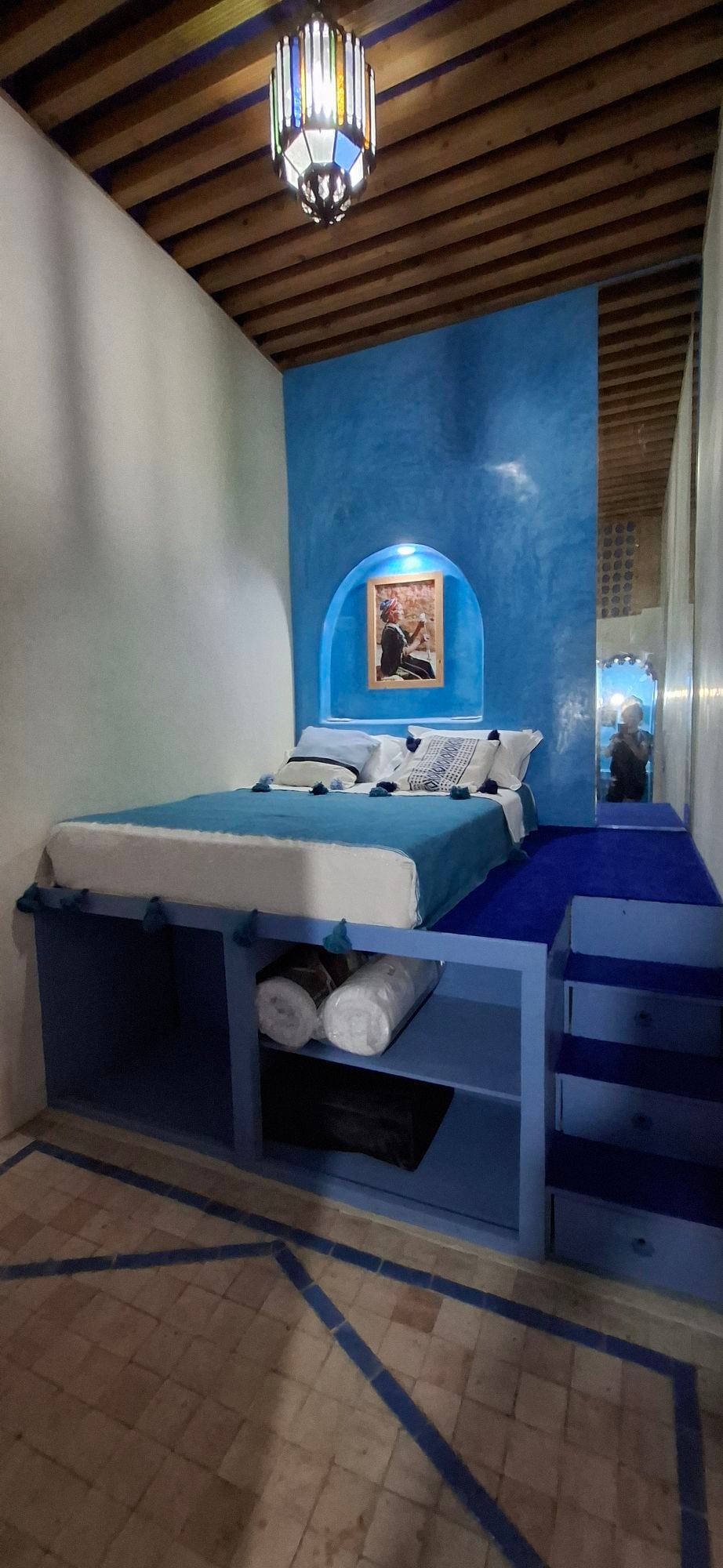 As you step inside Nebta, you will be greeted by its charming green courtyard, decorated with beautiful tiles, granito floors, white arches and modern handcrafted furnitures. You can enjoy your morning coffee inside or on the sunny terrace, surrounded by the scent of blooming flowers and the sound of trickling water. The house is a sweet combination between its traditional structure from the 19th century and a modern/refined decoration, which creates a peaceful and fresh experience of Tangier.